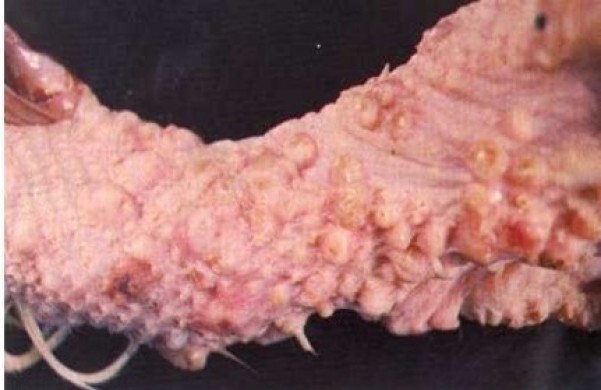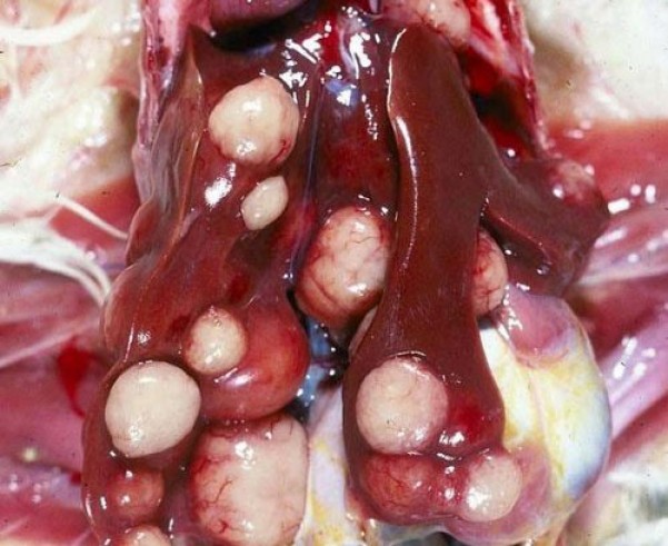 - Quan sát thấy ở đàn gà dưới 16 tuần tuổi có các u lympho ở nội tặng như gan, tim, cơ quan sinh dục, da, cơ, dạ dày tuyến.