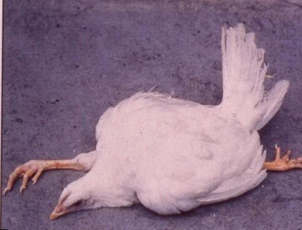 - Gà liệt chân, một chân duỗi về phía trước, một chân duỗi về phía sau. Cánh sã một bên hoặc cả hai bên, đầu và cổ hạ thấp xuống. Gà thường chết do bị đói hoặc khát do không thể đi lại ăn uống.