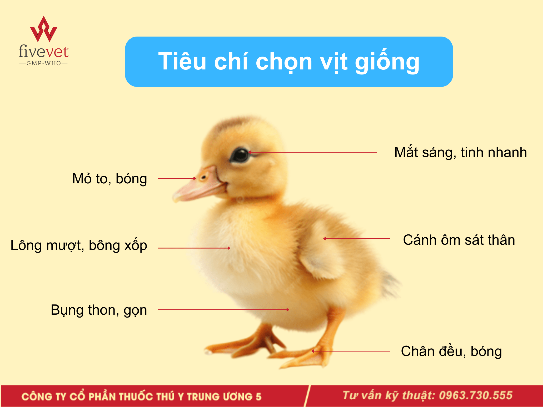 Khi chọn vịt giống, cần ưu tiên những con vịt khỏe mạnh, nhanh nhẹn, dáng đi vững vàng, lông bông mượt, mắt sáng, bụng gọn, chân cứng cáp, có màu lông tơ đặc trưng của giống. Nên đưa vịt con xuống chuồng nuôi trong vòng 24 giờ sau khi nở để đảm bảo sức khỏe và khả năng thích nghi tốt nhất.
