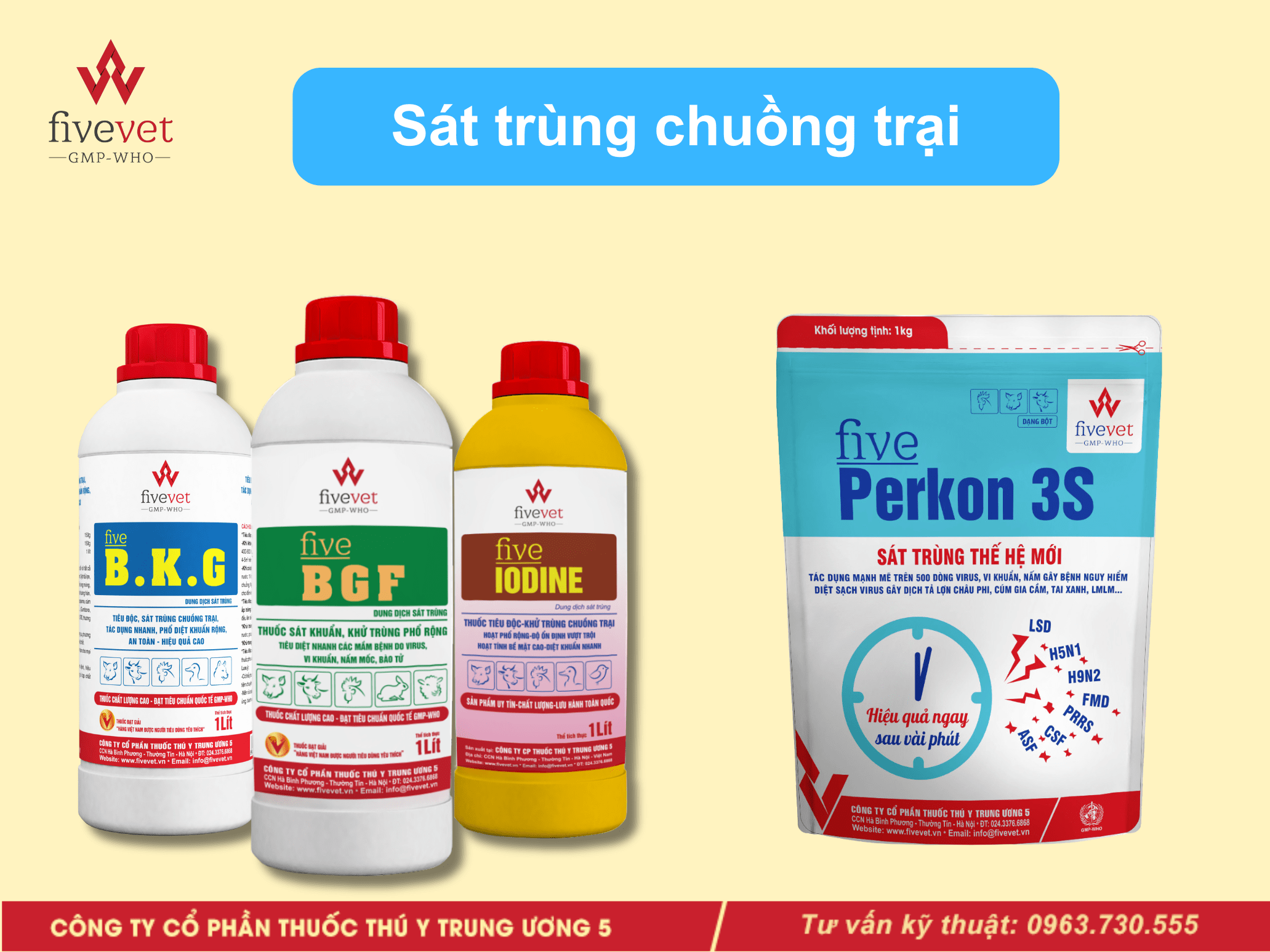 Thường xuyên trại được vệ sinh, sát trùng định kỳ bởi một trong các sản phẩm sau: Five-Iodine, Five-BGF, Five-B.K.G, Five-Perkon 3S,…