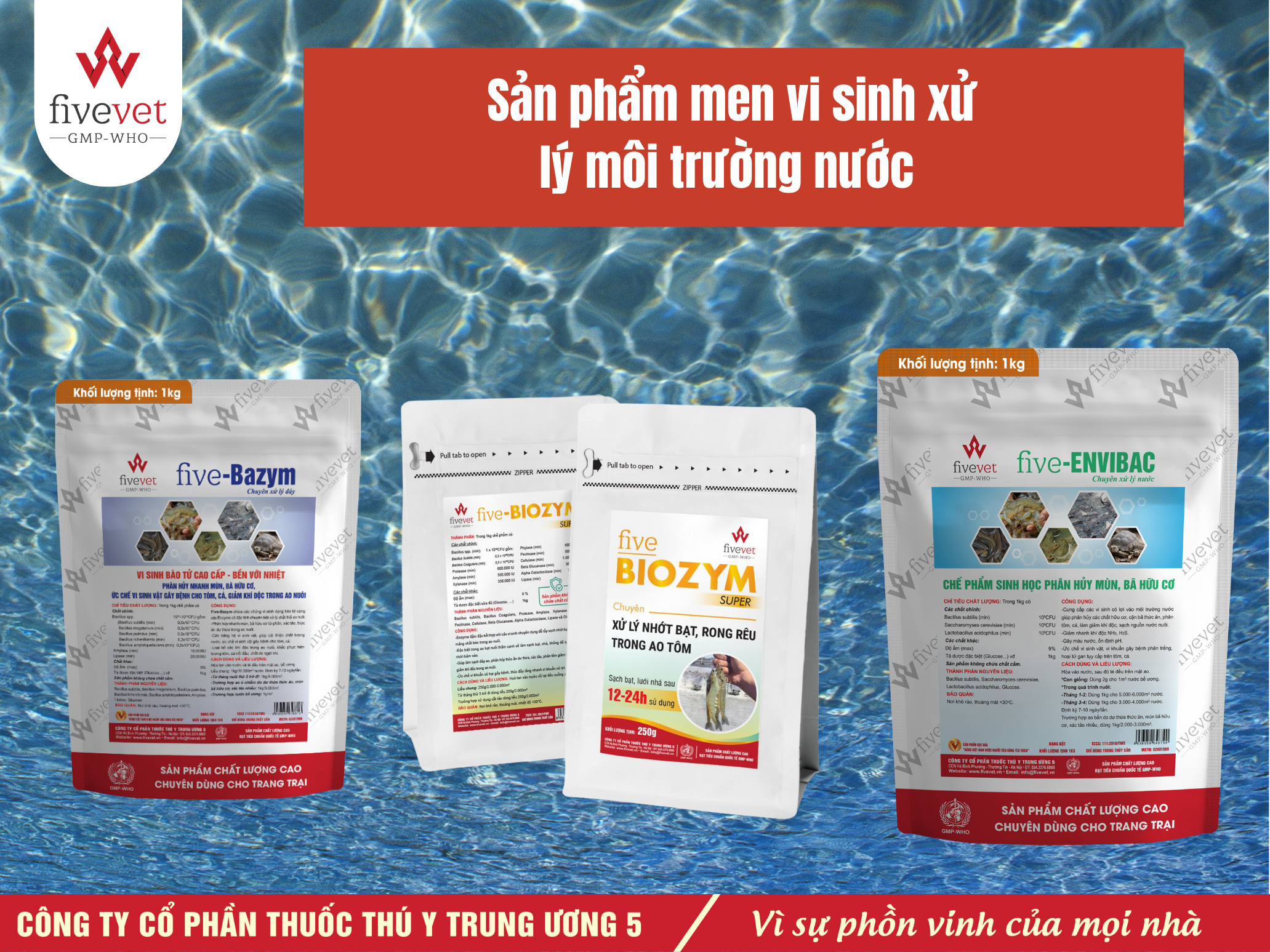 Hiện nay trên thị trường có nhiều dòng men vi sinh phổ biến, đáp ứng tốt các tiêu chí trên. Một trong những giải pháp đang được nhiều người nuôi tin dùng là Five-Bazym - chế phẩm men vi sinh đa dụng từ thương hiệu Fivevet, có khả năng xử lý khí độc, giảm nhớt đáy ao và giúp ổn định môi trường nước hiệu quả, nhất là trong điều kiện thời tiết xấu và mùa mưa bão.