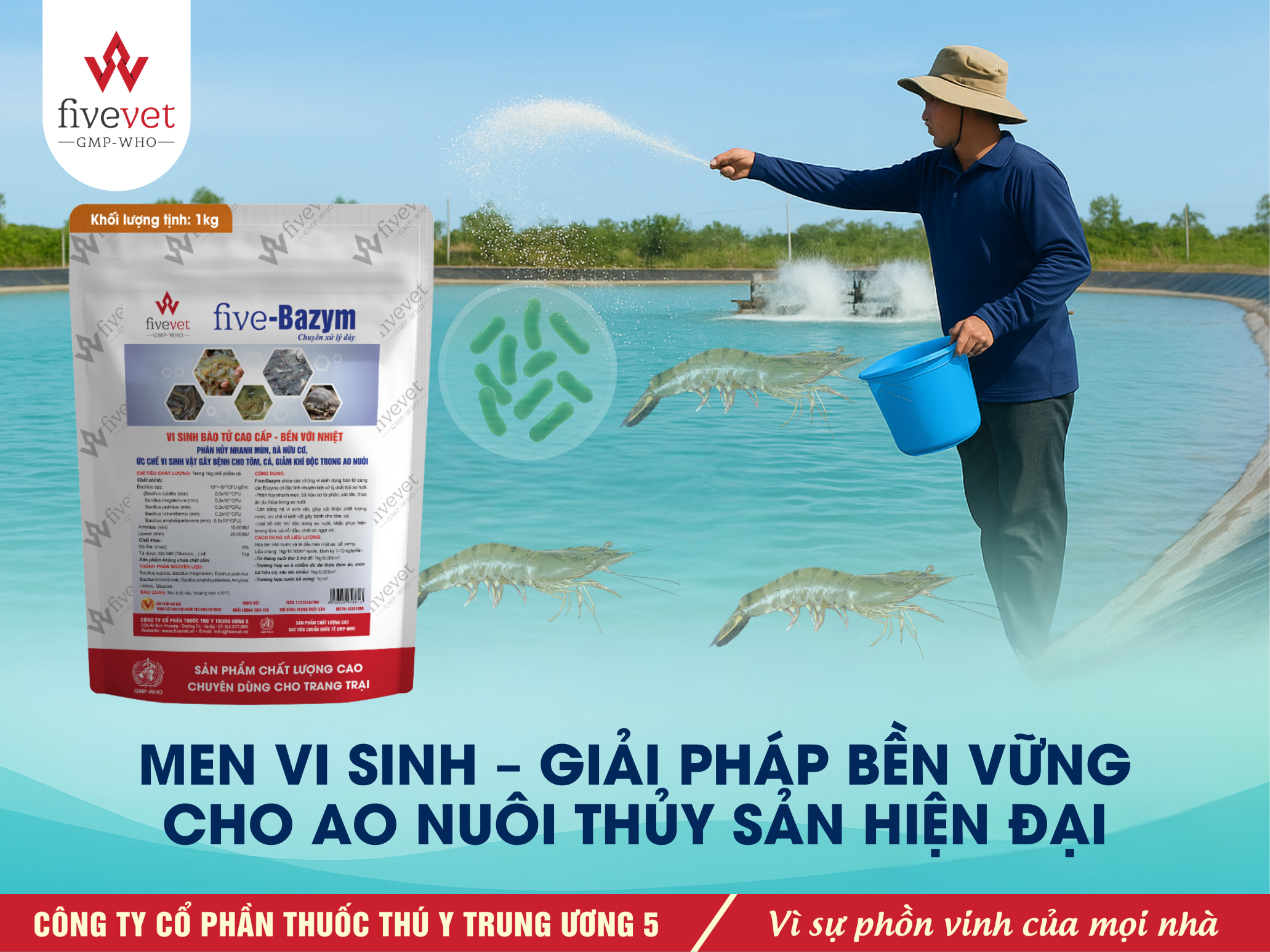 Trong ngành nuôi trồng thủy sản, việc duy trì một môi trường ao nuôi sạch sẽ, ổn định, bền vững và không ô nhiễm là yếu tố sống còn để đảm bảo sức khỏe vật nuôi, tăng năng suất nuôi trồng. Một trong những giải pháp được xem là hiệu quả và bền vững nhất hiện nay chính là sử dụng men vi sinh. Trong bài viết này, Fivevet sẽ cùng bạn tìm hiểu chi tiết về vai trò, lợi ích cũng như cách sử dụng men vi sinh một cách hiệu quả trong nuôi trồng thủy sản.