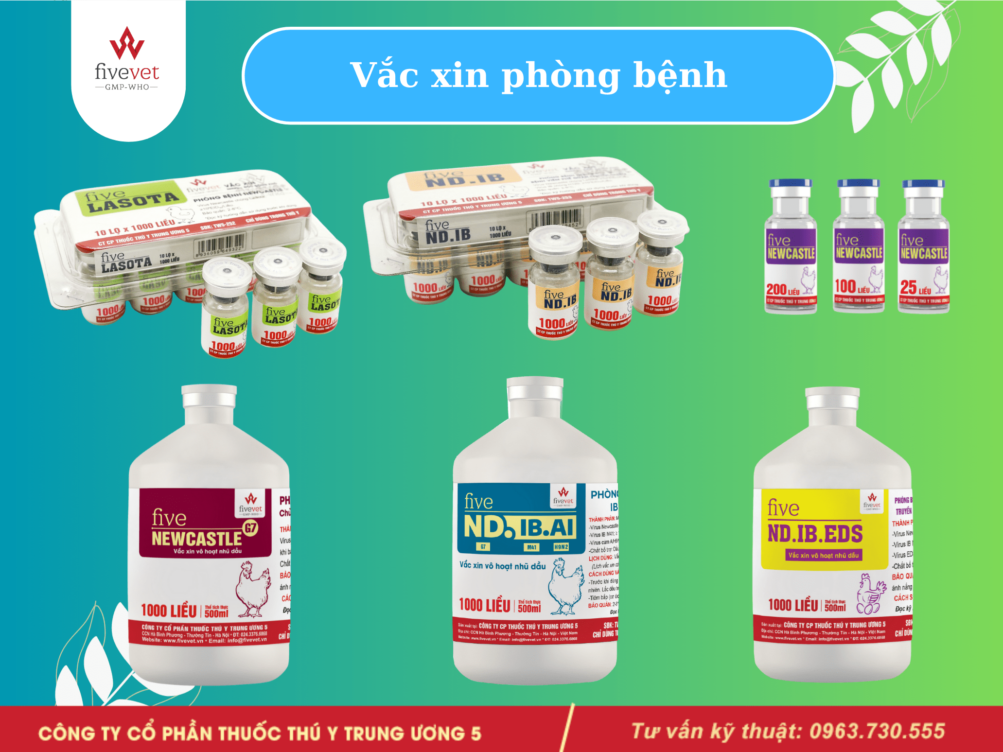 Five-ND.IB, Five-Lasota, Five-Newcatle (chủng M), Five-Newcastle (G7), Five-ND.IB AI (H9N2), Five-ND.IB.EDS,… theo lịch của từng trại.