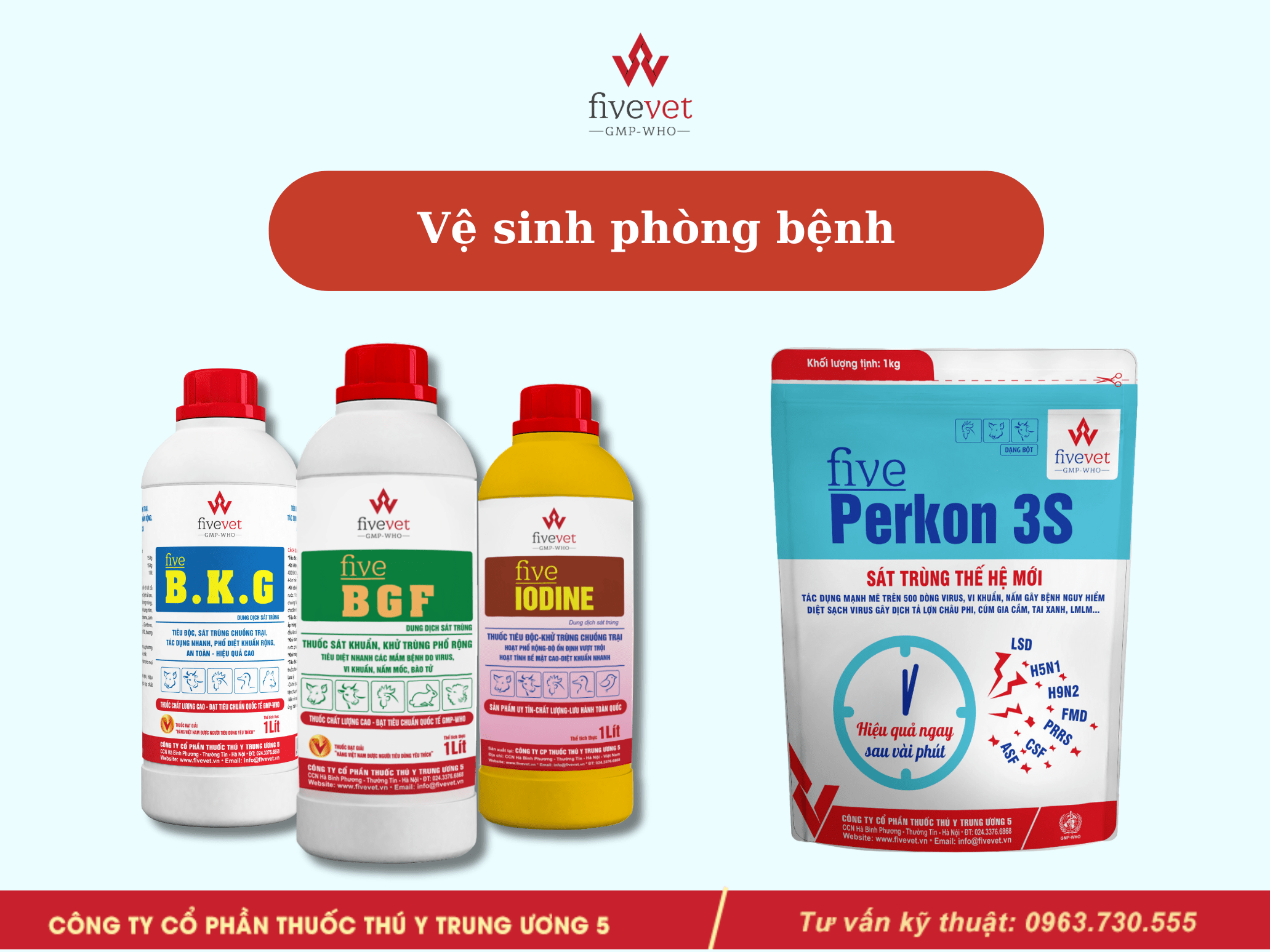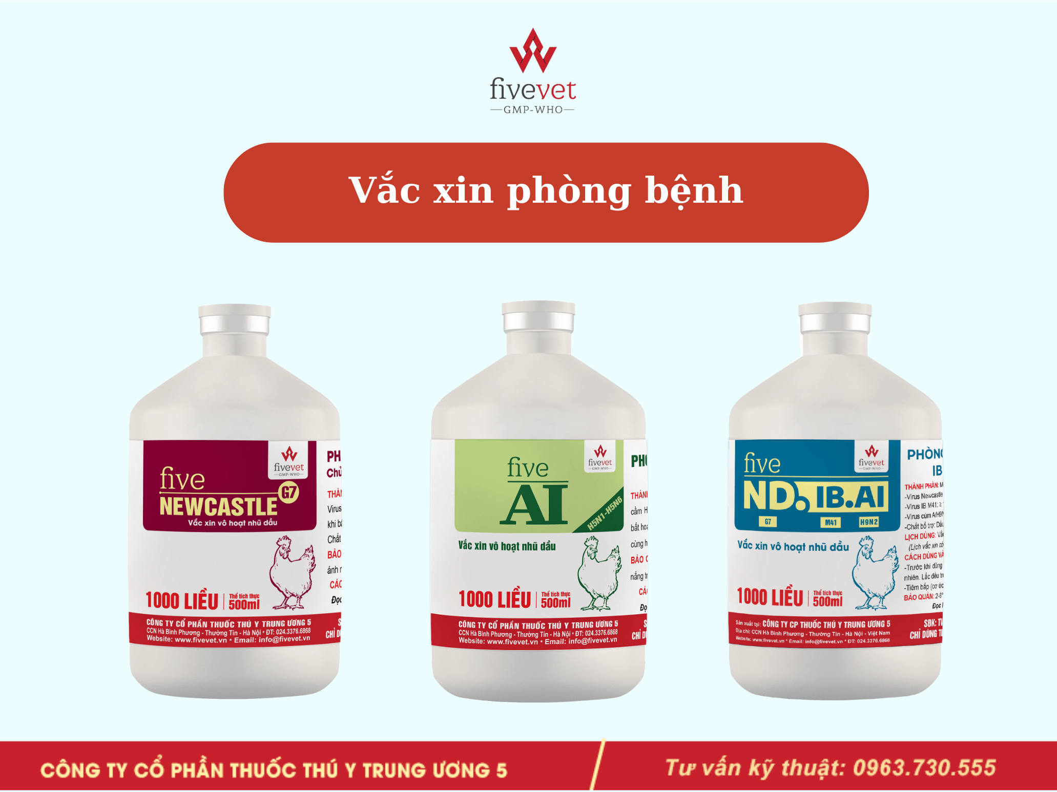 Phòng một số bệnh thường gặp bằng một trong các sản phẩm sau: Five-Amoxcin, Five-Neolin, Five-NP.10, Five-AmoxClav, Five-Dotylin, Five-Doflo, Five-Flo.30 oral, Five-Tylosin 98%, Five-Diclacoc, Five-Amsucox,…