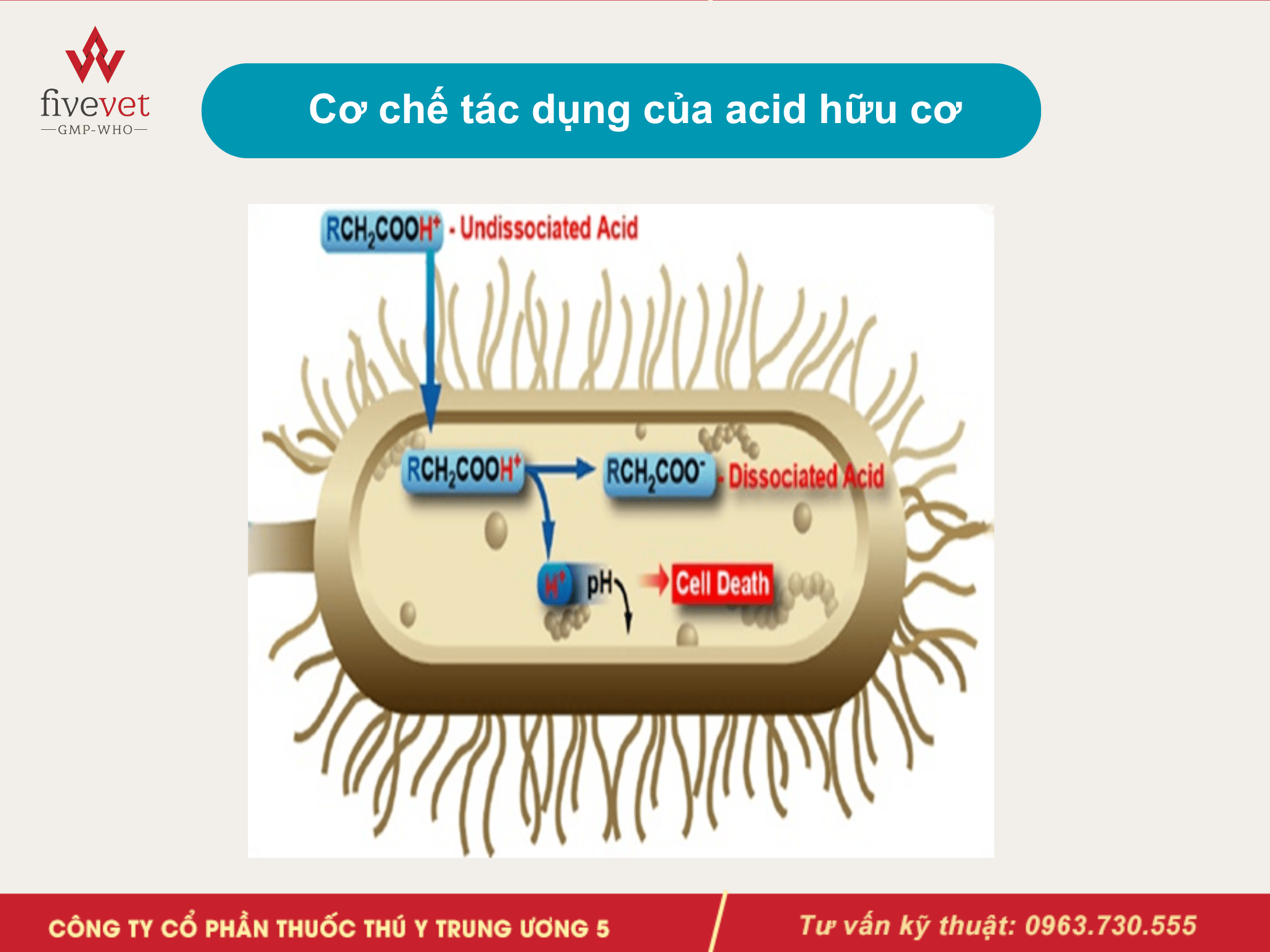 Cơ chế tiêu diệt vi khuẩn của acid hữu cơ được giải thích như sau: Ở dạng không phân ly, acid hữu cơ dễ dàng thấm qua màng tế bào vi khuẩn. Khi vào bên trong môi trường tế bào (có pH khoảng 7), acid sẽ phân ly và giải phóng ion H⁺, làm giảm pH nội bào. Để duy trì cân bằng, vi khuẩn phải tiêu tốn năng lượng kích hoạt bơm ATPase nhằm đẩy H⁺ ra ngoài, khiến nguồn năng lượng nhanh chóng cạn kiệt và tế bào bị chết.