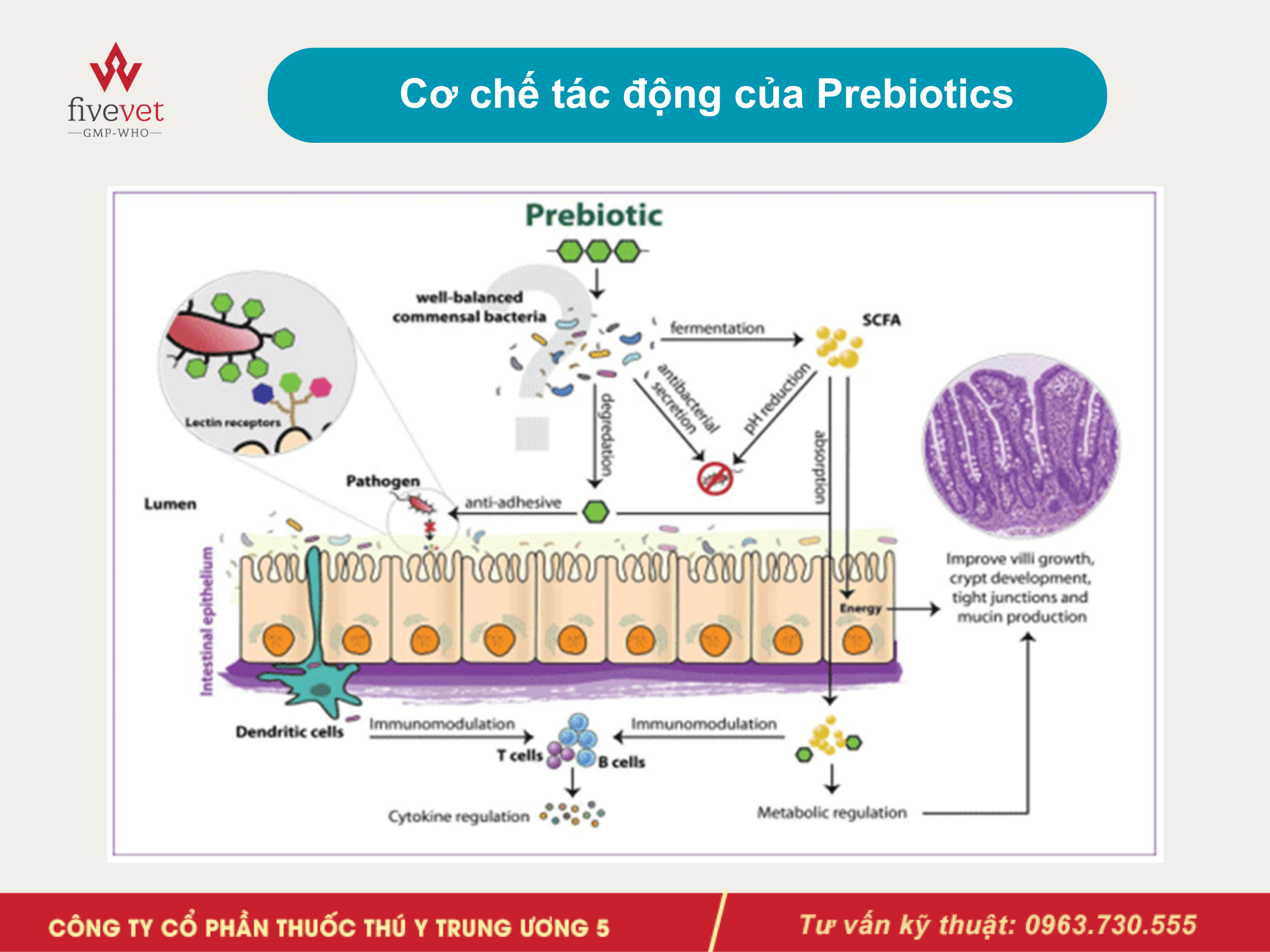 Cơ chế tác động của prebiotics: Khi vào ruột già, prebiotics thúc đẩy quá trình lên men, tạo ra các axit béo chuỗi ngắn (SCFA) như butyrate, propionate và acetate. Các SCFA này giúp giảm pH đường ruột, cung cấp năng lượng cho tế bào biểu mô ruột, điều hòa viêm và cải thiện chức năng trao đổi chất.