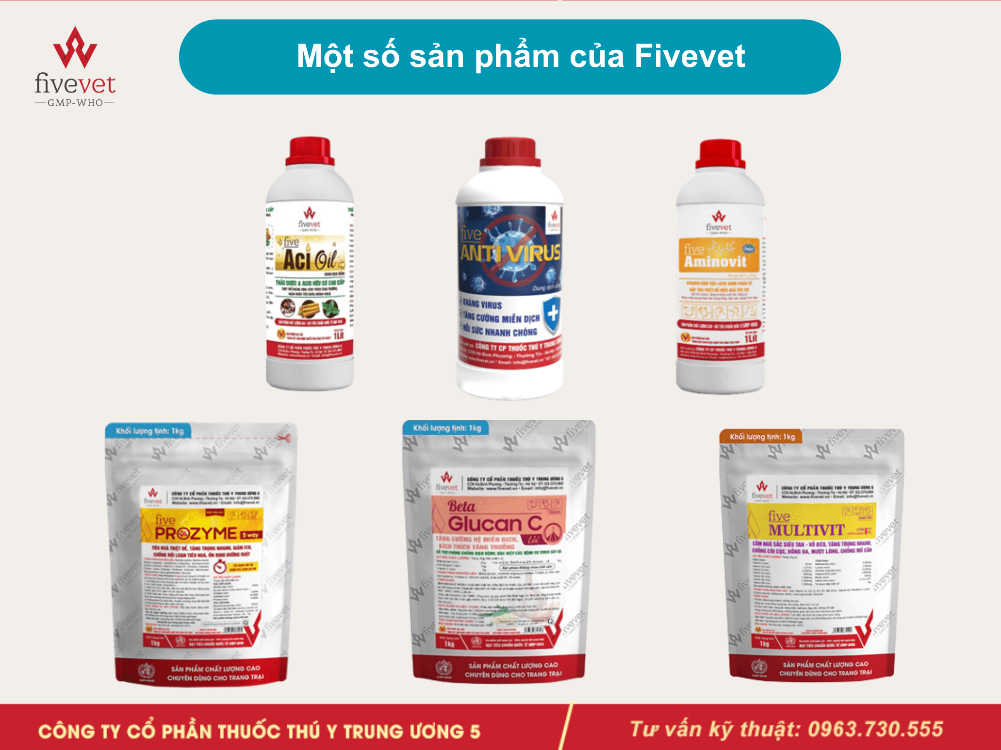 Một số sản phẩm Fivevet có chứa các thành phần dinh dưỡng thúc đẩy tăng trọng:  Five-Aminovit super, Five-Acid Oil, Five-Anti virus, Beta-Glucan C tỏi, Five-Prozyme 5way, Five-Multivit,...
