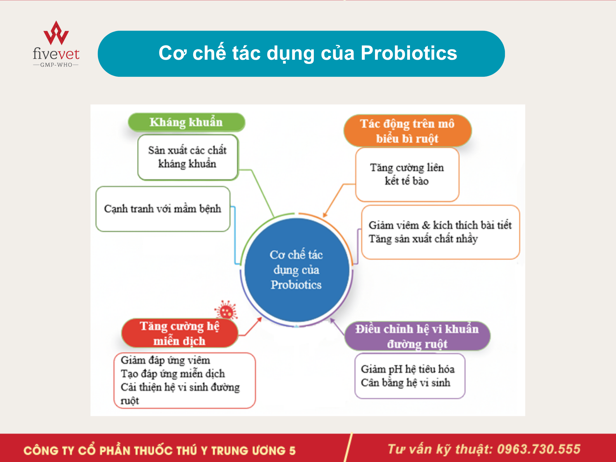 Nhờ cơ chế đa dạng, probiotics giúp ổn định hệ vi sinh đường ruột, tăng cường miễn dịch, nâng cao khả năng hấp thu dinh dưỡng, từ đó thúc đẩy tăng trưởng, giảm FCR, hạn chế sử dụng kháng sinh và hướng tới chăn nuôi an toàn, bền vững.