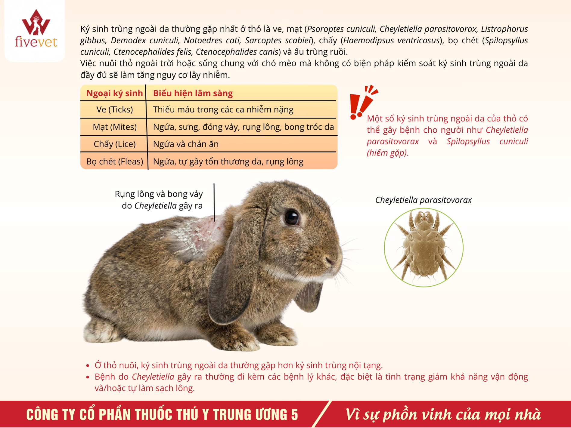 Ở thỏ nuôi trong nhà, ký sinh trùng ngoài da có xu hướng xuất hiện nhiều hơn so với ký sinh trùng nội tạng, bởi môi trường kín, ít vận động và nguy cơ nhiễm chéo từ thú cưng khác.