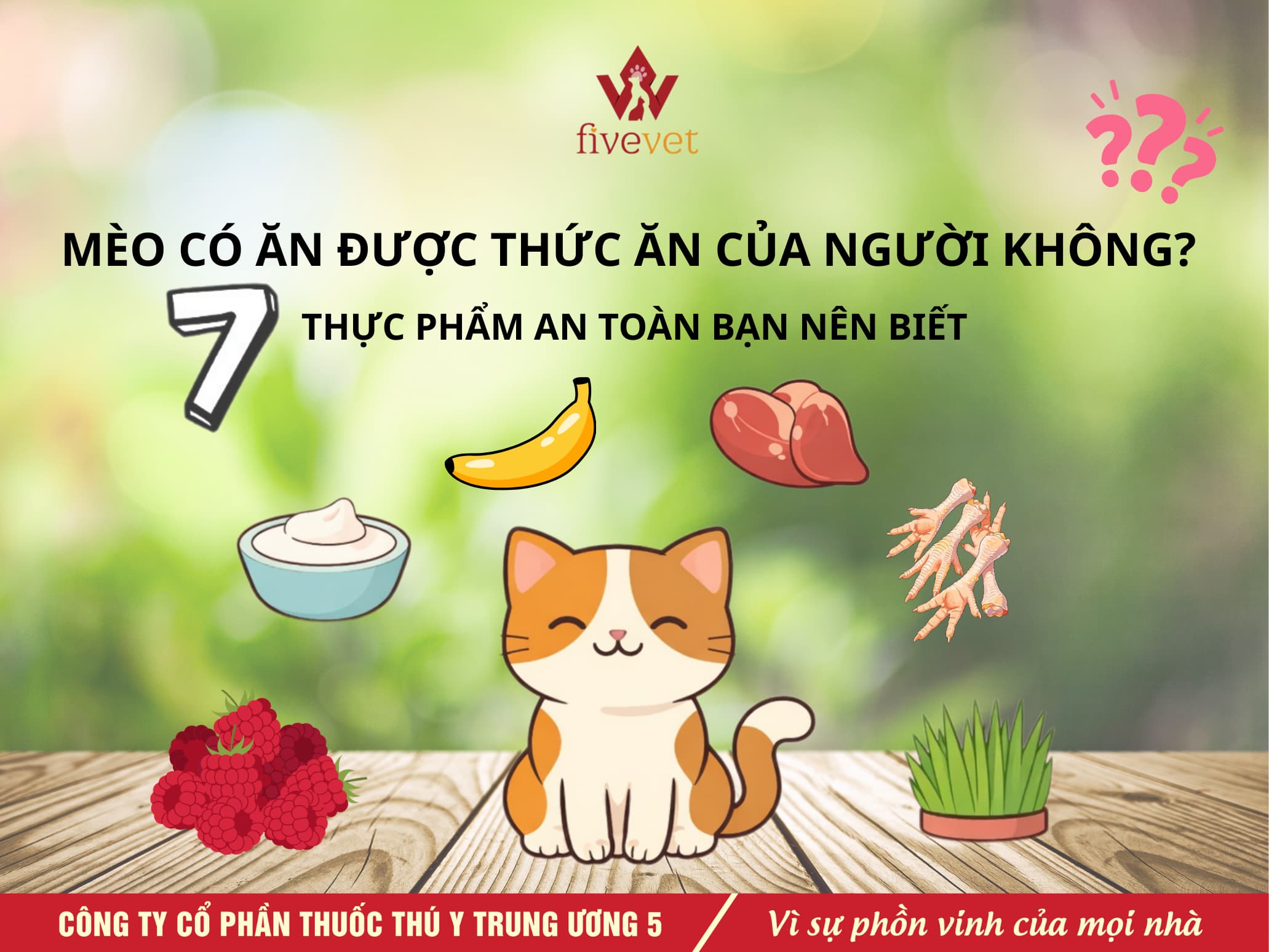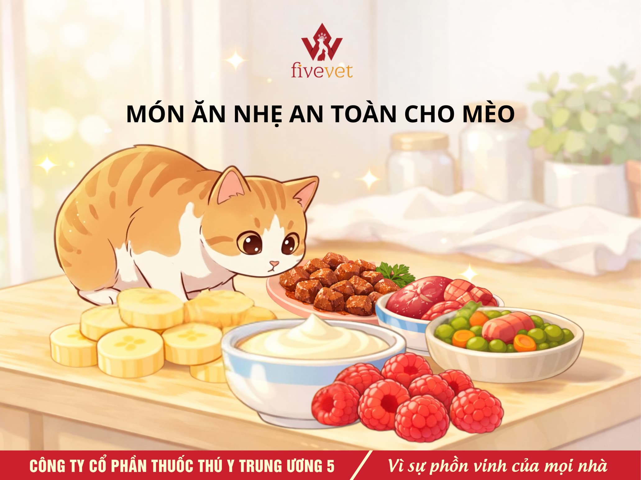 Vì vậy, không phải món ăn nào của chúng ta cũng phù hợp với mèo. Trong bài viết này, FivePet (Fivevet for pet) sẽ chia sẻ 7 loại thực phẩm mèo có thể ăn với lượng nhỏ và đúng cách, kèm những lưu ý quan trọng để đảm bảo an toàn.