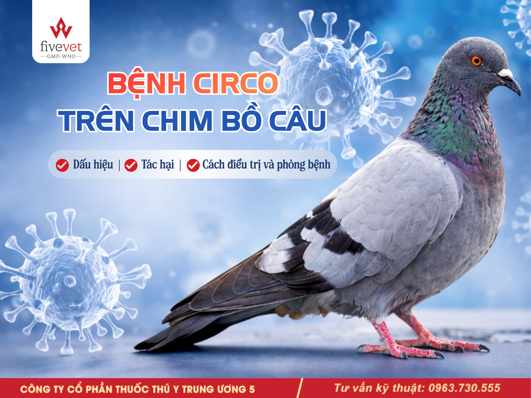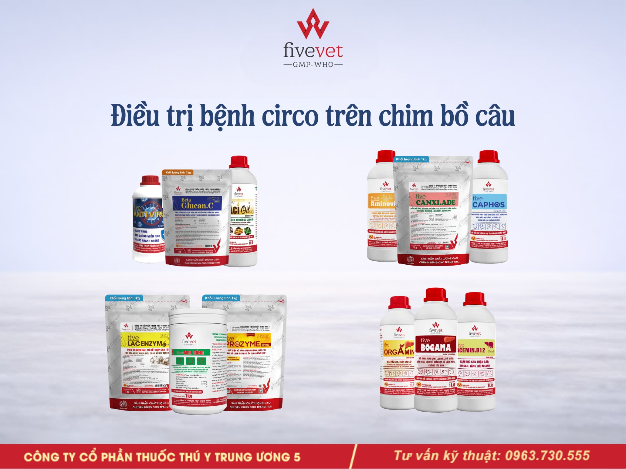 Sử dụng một trong các sản phẩm sau để nâng cao đề kháng cho bồ câu: Five-Anti Virus, Beta Glucan.C, Five-Mix Lyte, Five-Aci Oil,…