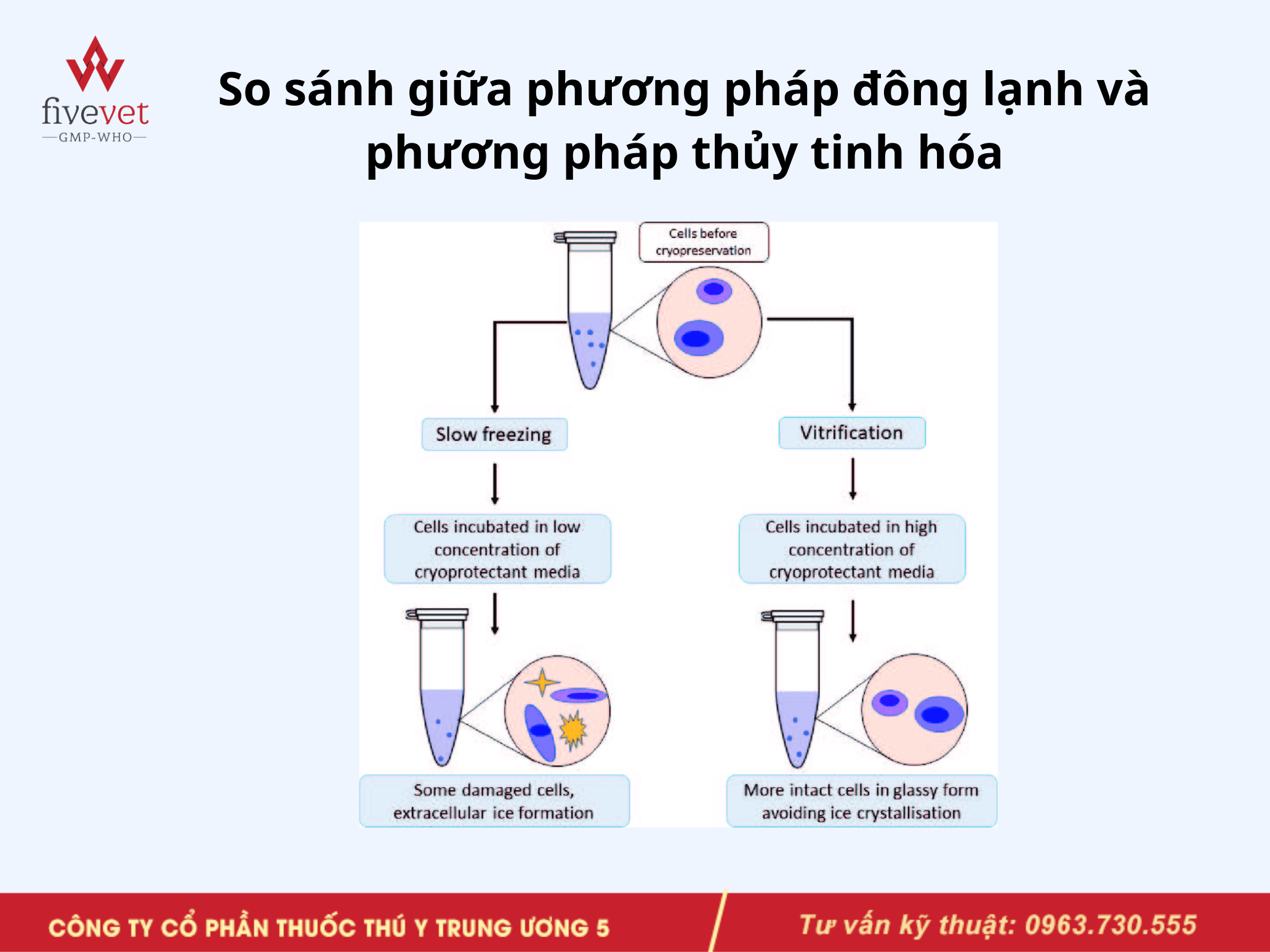 Fivevet chia sẻ đầy đủ quy trình bảo quản đông lạnh tế bào dòng: chuẩn bị tế bào, chọn môi trường trữ đông, kiểm soát nhiệt độ và đánh giá chất lượng sau rã đông, giúp tối ưu hiệu quả nghiên cứu.