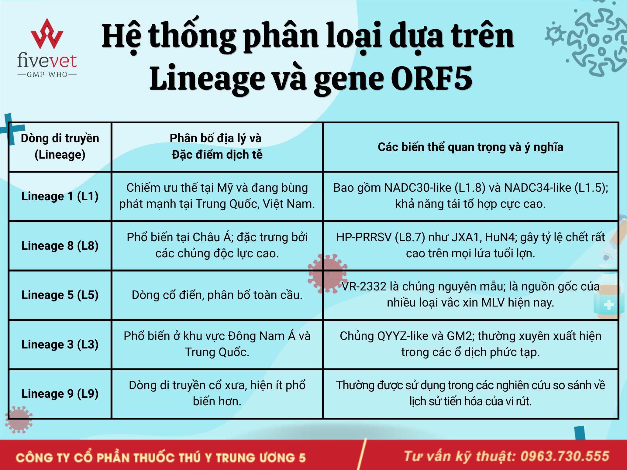 Trong bối cảnh đó, việc nghiên cứu và giải mã chi tiết cấu trúc hệ gen của PRRSV, chức năng của từng khung đọc mở (ORF) cũng như phân loại các dòng di truyền (lineages) có ý nghĩa vô cùng quan trọng. Đây không chỉ là cơ sở khoa học mà còn là nền tảng thực tiễn giúp phát triển các loại vắc xin có khả năng bảo hộ chéo rộng, đáp ứng nhu cầu cấp thiết của ngành chăn nuôi hiện đại, đồng thời là định hướng mà Fivevet hướng tới nhằm nâng cao hiệu quả phòng chống bệnh tai xanh.