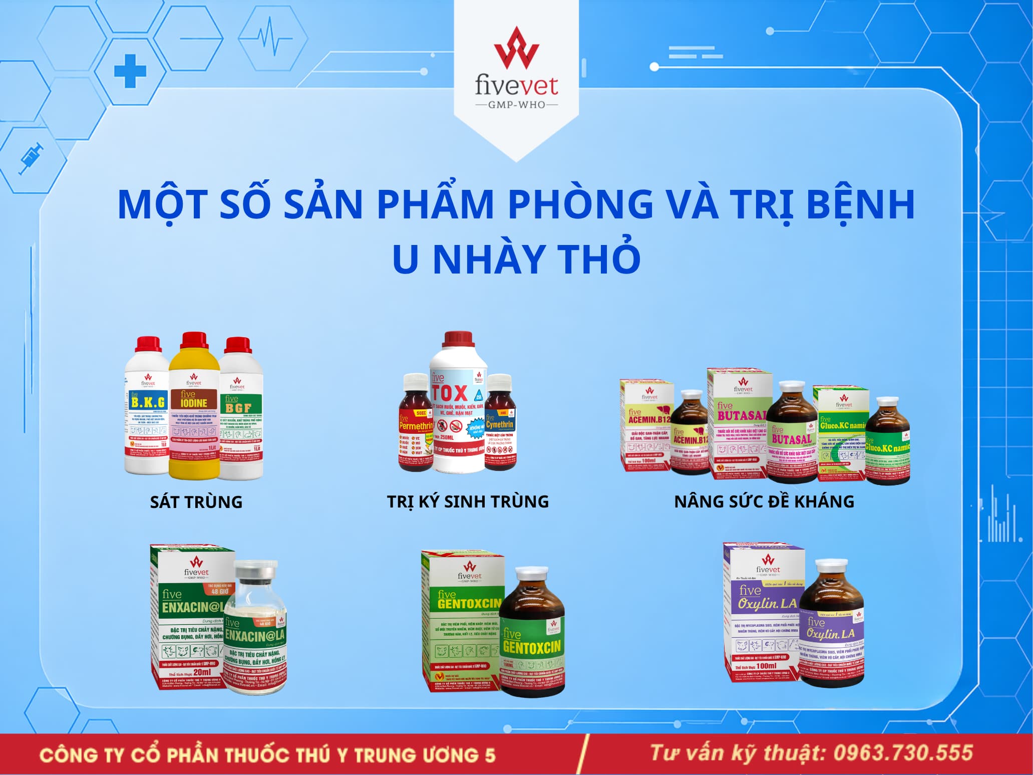 - Song song với đó, cần phun sát trùng toàn bộ khu chuồng nuôi và khu vực xung quanh bằng một trong các sản phẩm như: Five-BGF, Five-B.K.G, Five-Iodine, Five-Perkon 3S,... kết hợp với các thuốc diệt ký sinh trùng như: Five-Tox, Five-Permethrin, Five-Cymethrin, Five-Kill Fly I,...