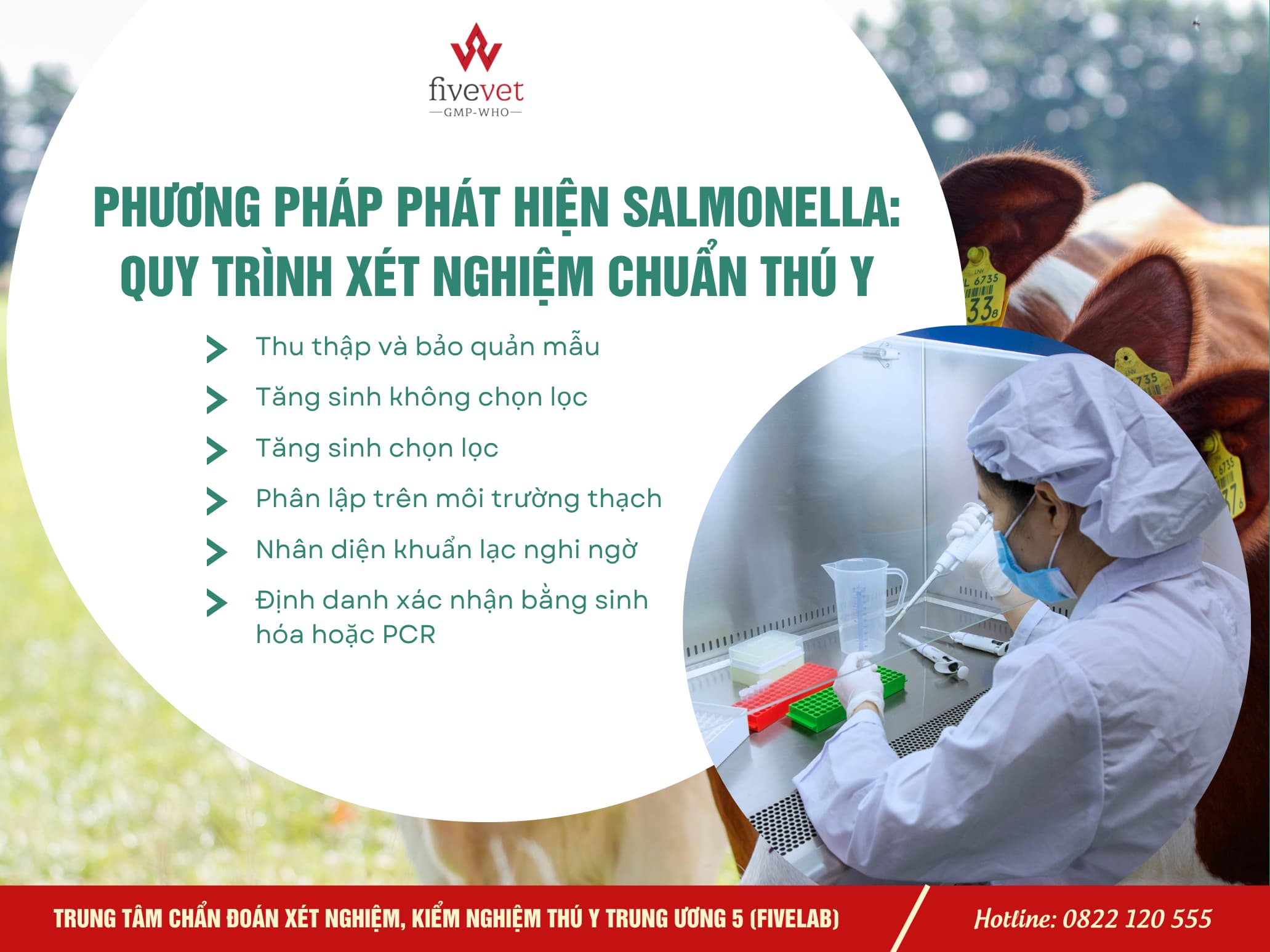 Phát hiện Salmonella trong thực phẩm bằng quy trình xét nghiệm thú y chuẩn ISO giúp kiểm soát nguy cơ, đảm bảo an toàn thực phẩm và nâng cao chất lượng sản phẩm chăn nuôi. Fivevet sẽ giúp bạn hiểu rõ quy trình phát hiện Salmonella một cách khoa học, chính xác và dễ triển khai trong thú y.