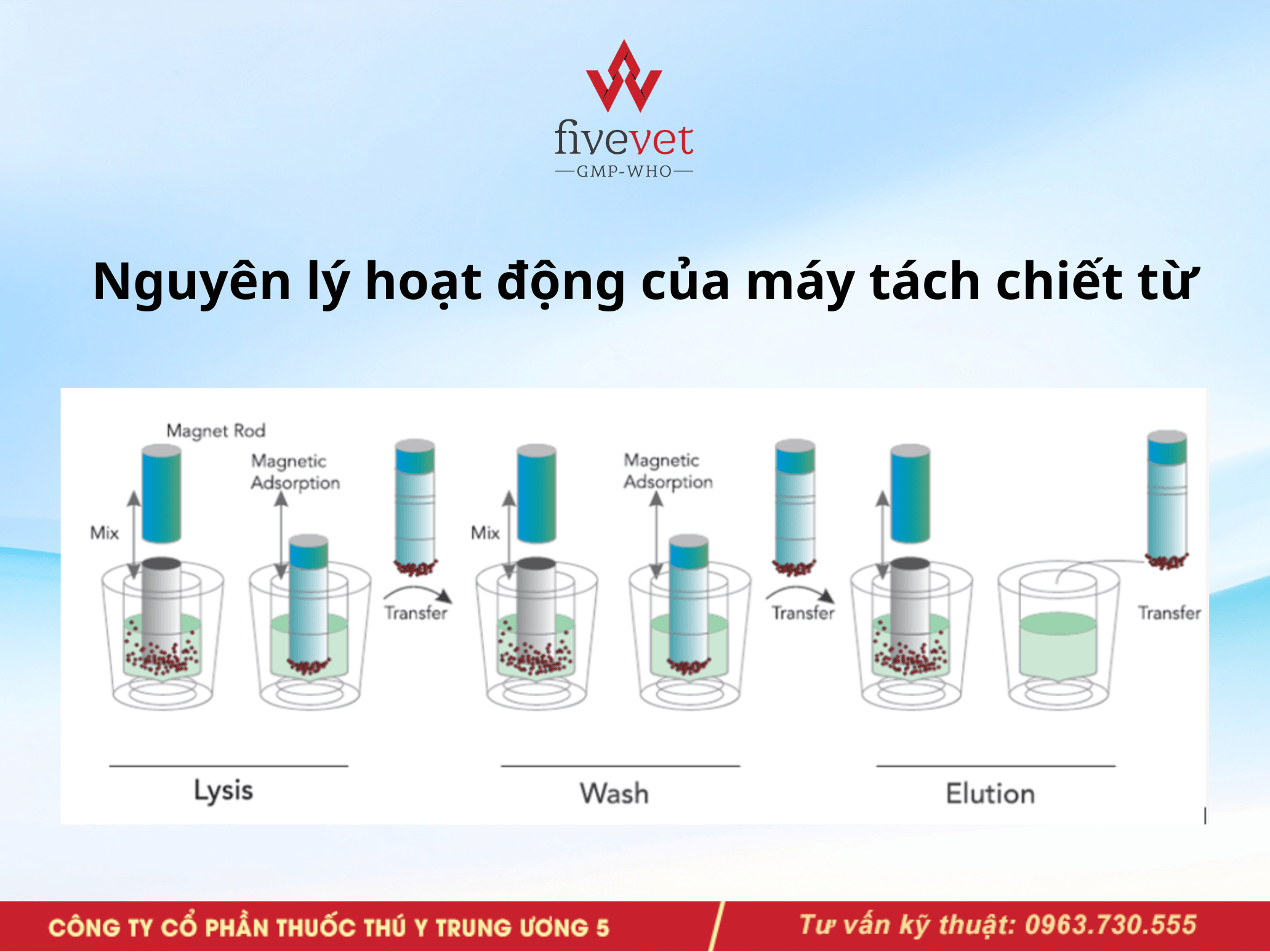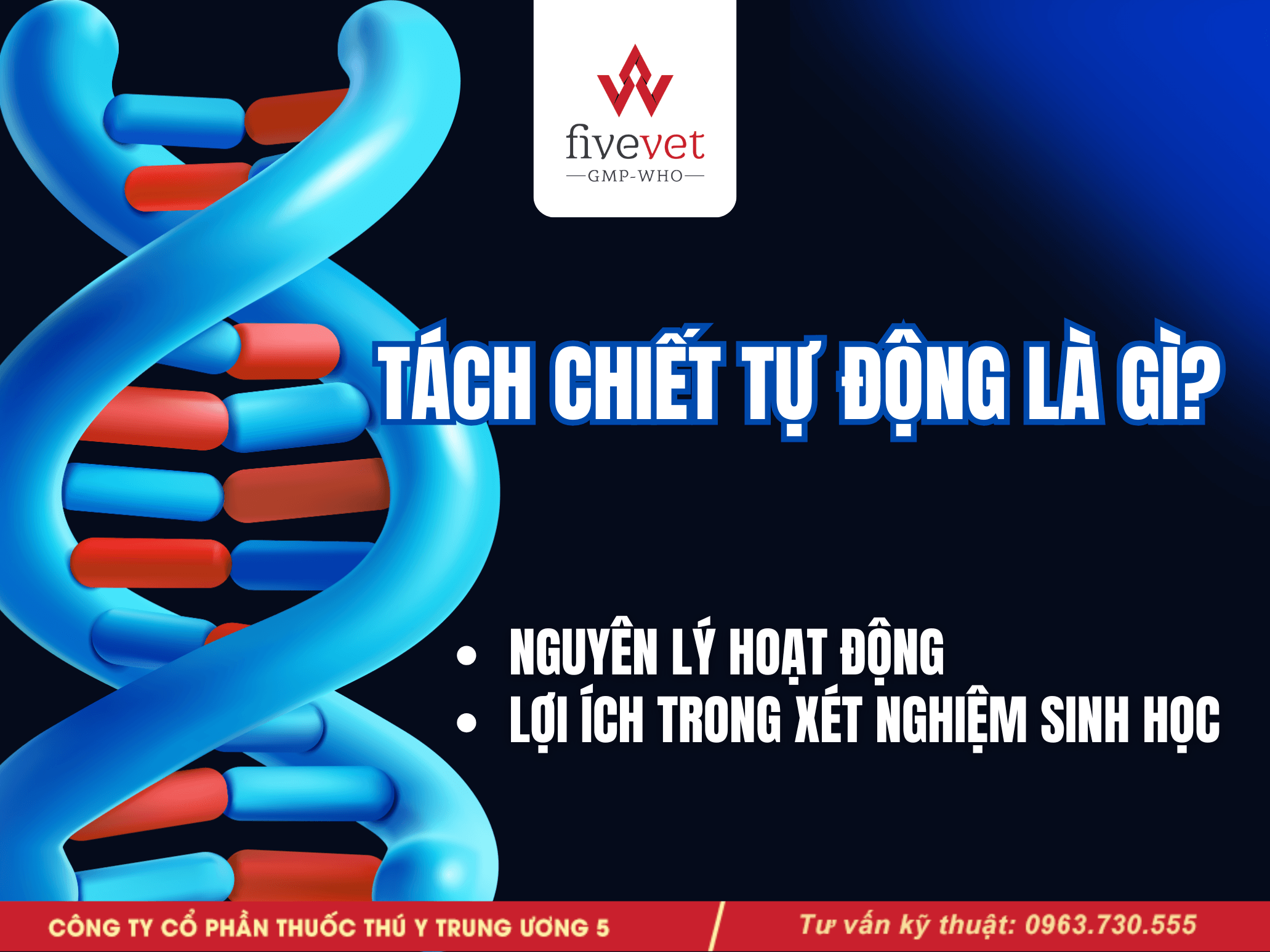 Tách chiết tự động là giải pháp tối ưu giúp xử lý mẫu nhanh chóng và hiệu quả, đặc biệt phù hợp khi cần xử lý số lượng mẫu lớn. Phương pháp này còn góp phần giảm thiểu nguy cơ nhiễm chéo trong quá trình thao tác. Bộ kit tách chiết sử dụng hạt từ (đóng vai trò quan trọng trong việc liên kết với DNA/RNA), kết hợp cùng hệ thống tự động hóa giúp toàn bộ quy trình diễn ra đồng nhất, chính xác và tuân thủ theo chương trình đã được cài đặt sẵn. Đây cũng là hướng tiếp cận hiện đại được nhiều đơn vị, trong đó có Fivevet, ứng dụng nhằm nâng cao độ tin cậy và hiệu quả trong phân tích mẫu.