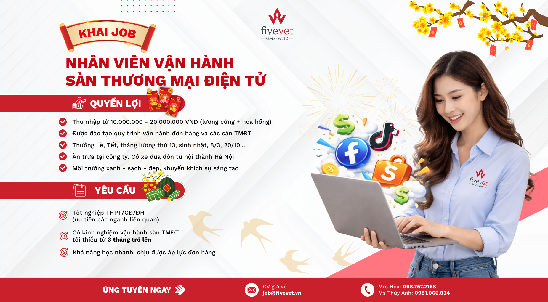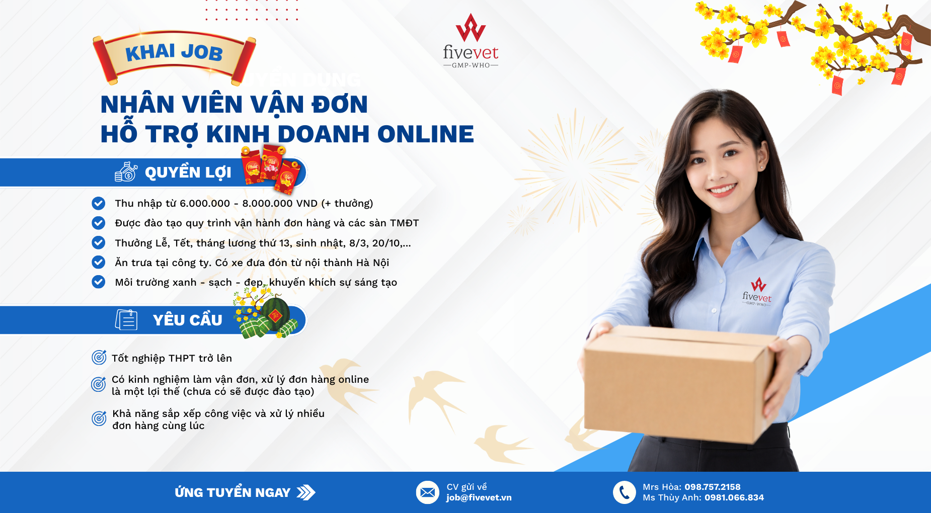 Xem thêmCông ty cổ phần Thuốc thú y Trung Ương 5 (Fivevet) là một trong những công ty dẫn đầu trong lĩnh vực nghiên cứu, sản xuất và kinh doanh sản phẩm dành cho thú y, thú y thủy sản, thú cưng. Để đáp ứng nhu cầu mở rộng kinh doanh các mặt hàng thuốc, vắc xin và chế phẩm sinh học chất lượng và hiệu quả đến phục vụ người chăn nuôi một cách nhanh nhất, Công ty cần tuyển dụng vị trí sau: