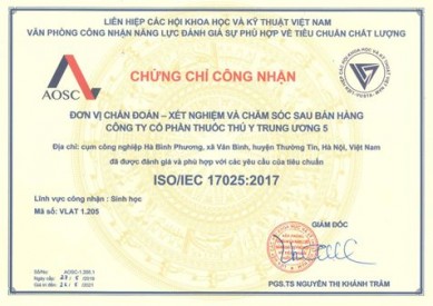 Ngày 27 tháng 05 năm 2019, Liên hiệp các hội Khoa học và Kỹ thuật Việt Nam đã chứng nhận Đơn vị Chẩn đoán - Xét nghiệm và chăm sóc sau bán hàng của Công Ty Cổ Phần Thuốc Thú Y Trung Ương 5 đạt tiêu chuẩn ISO/IEC 17025:2017.