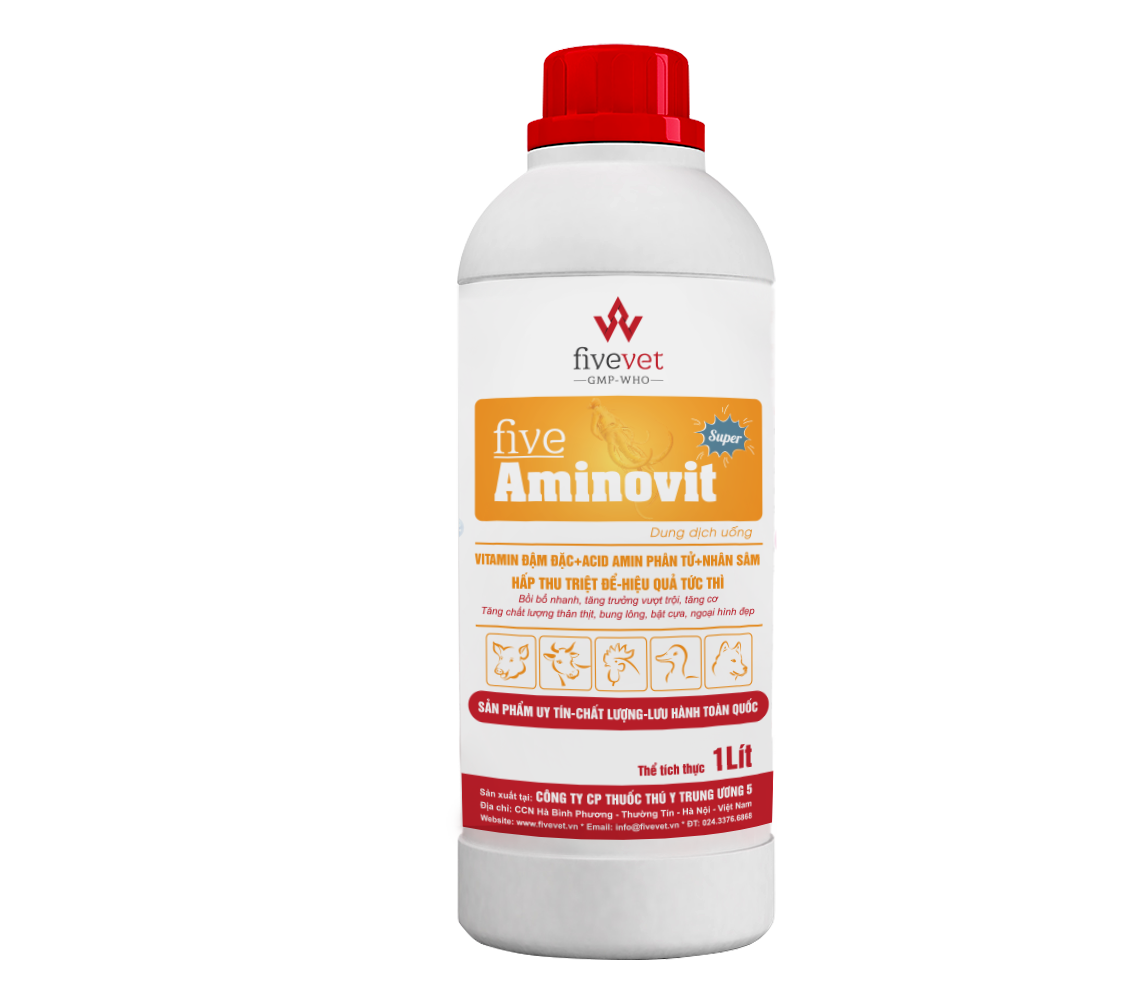 CÔNG DỤNG: Bổ sung Vitamin đậm đặc và Acid amin dạng phân tử giúp vật nuôi hấp thu nhanh chóng, hiệu quả nhìn thấy sau 3-5 ngày sử dụng. Đặc biệt, Five-Aminovit Super bổ sung đầy đủ các Acid amin thiết yếu (cơ thể vật nuôi không tự tổng hợp được) giúp cải thiện sức khoẻ, tăng cường miễn dịch, tăng khả năng sinh sản, hiệu suất chăn nuôi.