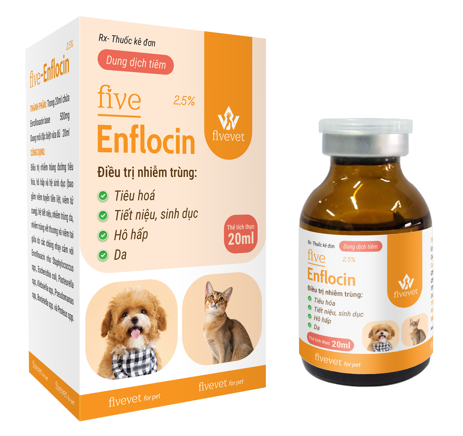 Điều trị nhiễm trùng đường tiêu hóa, hô hấp và hệ sinh dục (bao gồm viêm tuyến tiền liệt, điều trị kháng sinh bổ trợ cho nhiễm trùng ở tử cung), hệ tiết niệu, nhiễm trùng da, nhiễm trùng vết thương và viêm tai giữa do các chủng nhạy cảm với Enrofloxacin của Staphylococcus spp., Escherichia coli, Pasteurella spp., Klebsiella spp., Bordetella spp., Pseudomanas spp. và Proteus spp.