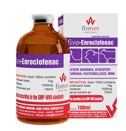 Five-Enfoclofenac is a combination of Enrofloxacin with Diclofenac, very effective for the prevention and treatment of infections caused by Gram (-), Gram (+) bacteria, Mycoplasma and Rickettsia and other secondary infections caused by virus.
