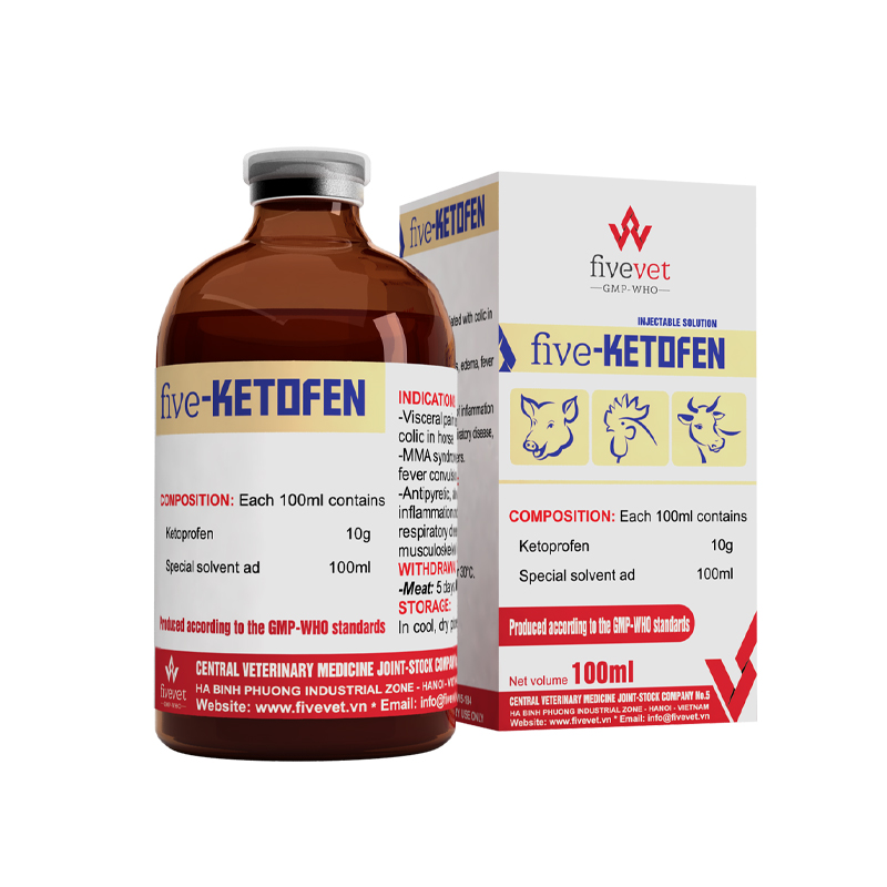 Five-Ketofen is indicated for antipyretic, alleviation of inflammation and pain in the treatment of respiratory diseases, acute pneumonia, mastitis, metritis, agalactia (M.M.A complex) in breeding sows, arthritis, foof rot, colic in horses, alleviation of pain after surgery.