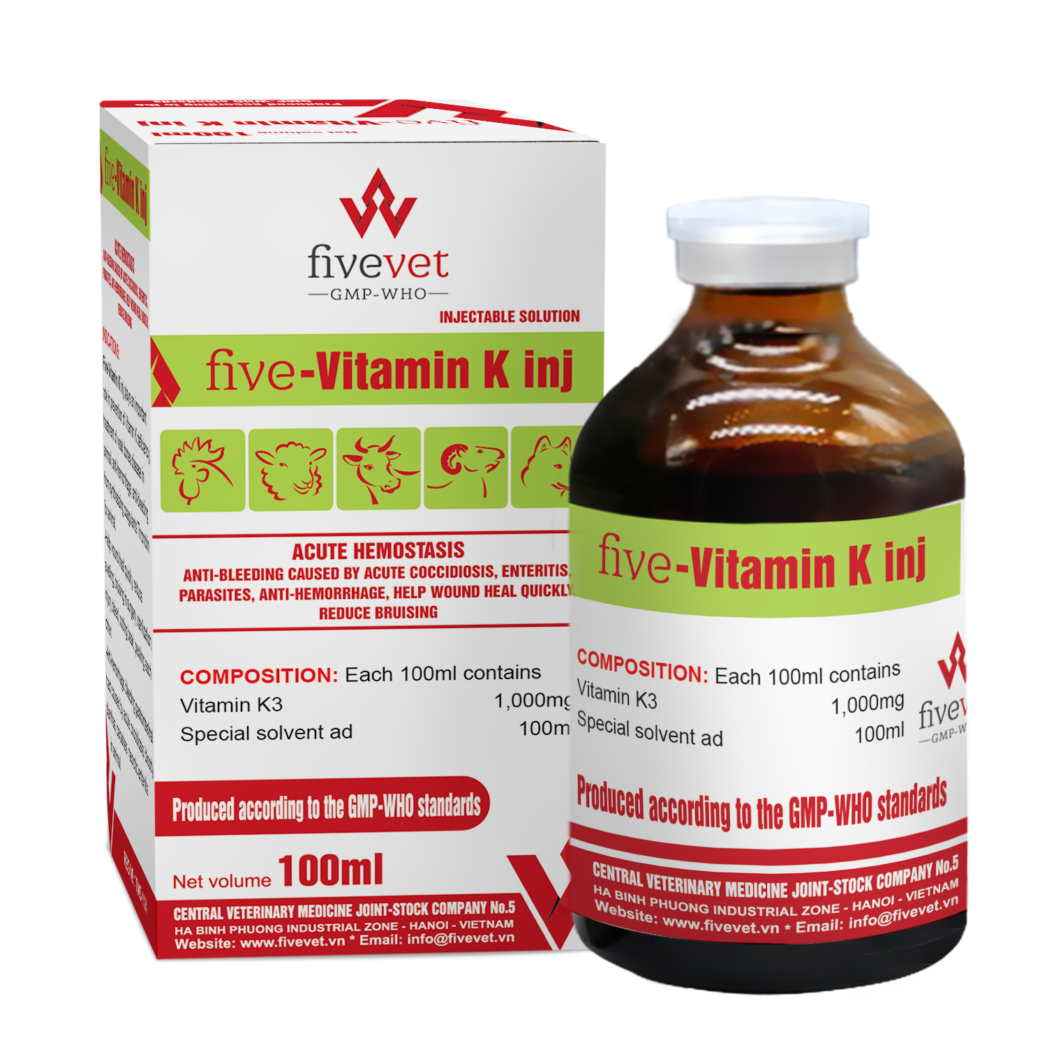 Five-Vitamin K inj plays an important role in prevention of vitamin K deficiency, treatment of bone weakening disease in animal, anti-hemorrhage, anti-bleeding from synthesizing coagulants Thrombin for animal.