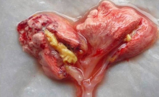 - Bên trong khí quản, 2 phế quản chính và phổi có bã đậu, mủ, dịch mủ.