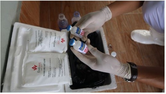 - Vận chuyển: Khi vận chuyển vắc-xin cần lưu ý đóng gói vắc-xin thật kỹ, tránh ánh nắng mặt trời chiếu trực tiếp. Tốt nhất dùng thùng bảo ôn, thùng xốp hoặc túi bảo quản lạnh; Nếu vận chuyển gần có thể dùng túi màu đen kèm theo đá lạnh để đảm bảo nhiệt độ thích hợp giúp ổn định chất lượng vắc-xin.