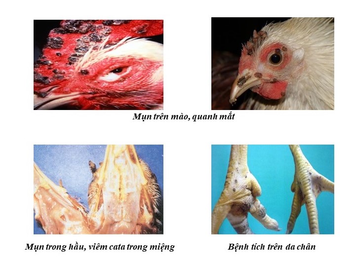 - Xuất hiện các nốt mụn to, nhỏ trên mặt đặc biệt vùng da mỏng như: mào, tích, khoé mắt, khoé miệng, mặt trong cánh, quanh hậu môn và da chân.