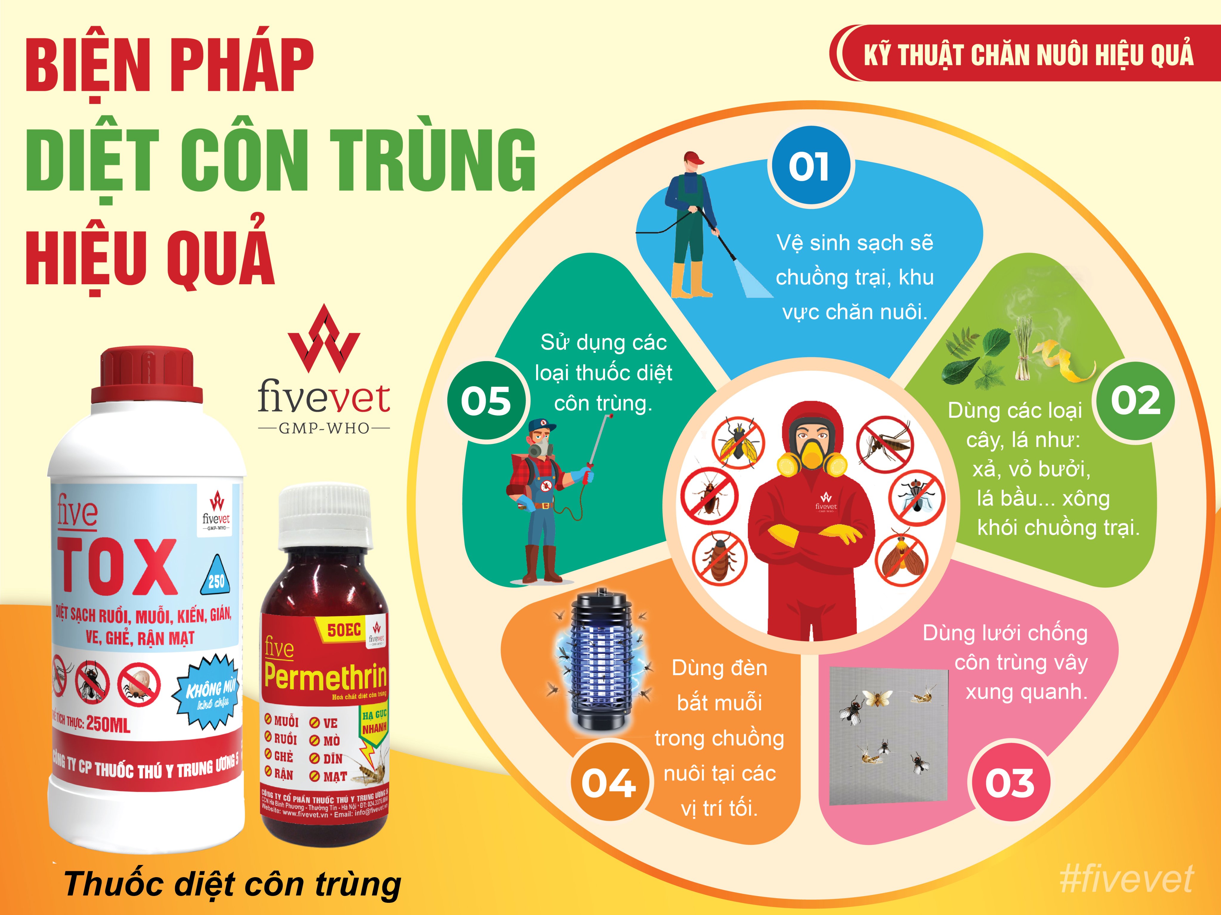 Five-Tox, Five-Permethrin, phun xung quanh chuồng nuôi. Khi sử dụng những loại thuốc này, bà con cần sử dụng đồ bảo vệ, pha chế liều lượng phù hợp để người và vật nuôi không bị ảnh hưởng.