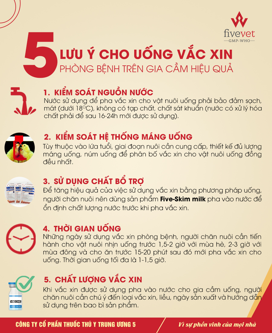 Hiện nay, trong chăn nuôi gà, cút, chim câu, ngan, vịt... một số loại vắc xin thường được sử dụng bằng phương pháp uống. Để nâng cao hiệu quả của vắc xin, Fivevet xin giới thiệu 5 lưu ý khi sử dụng vắc xin bằng đường uống: