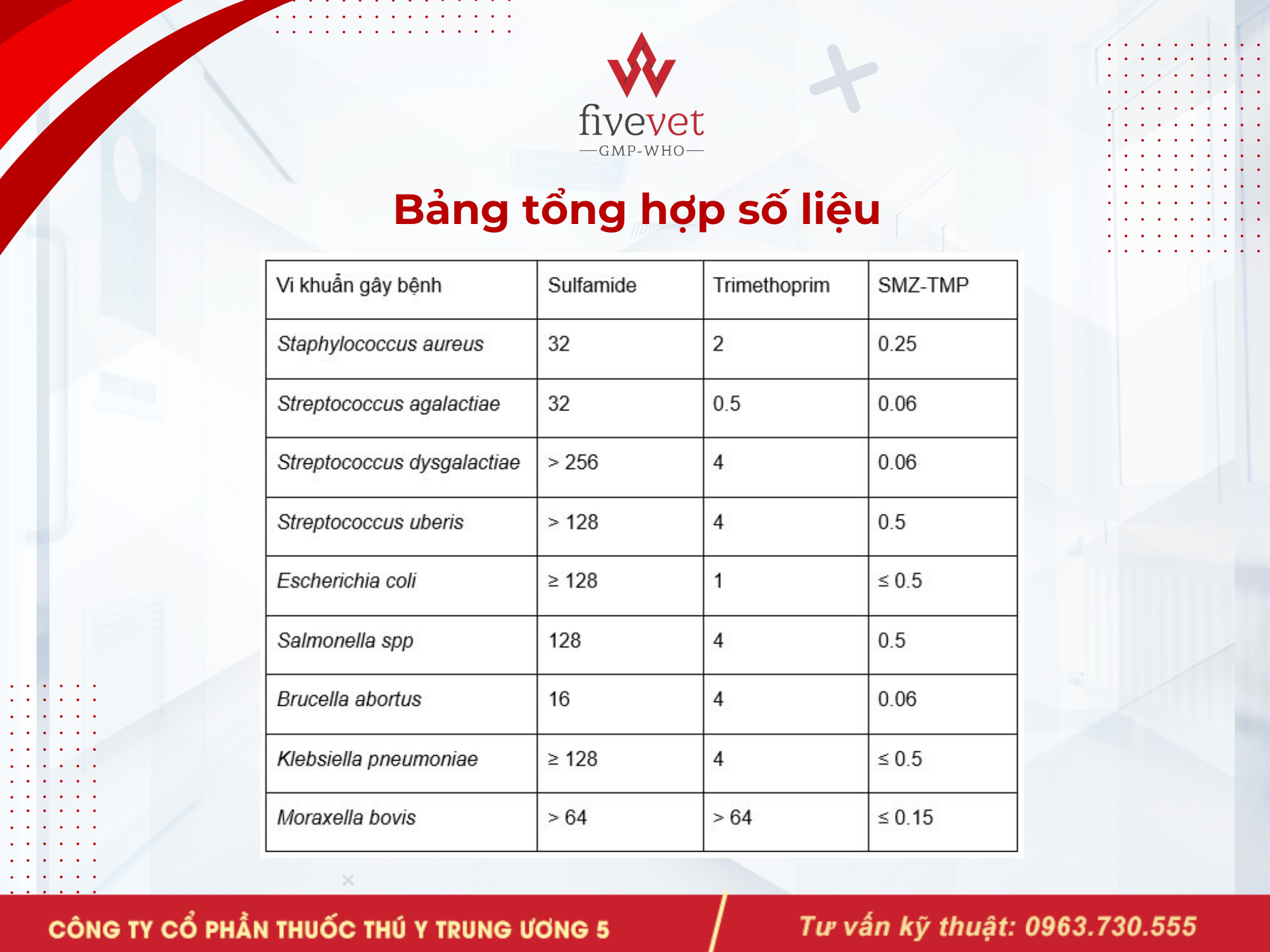 : Staphylococcus aureus, Streptococcus agalactiae, Streptococcus dysgalactiae, Streptococcus uberis, Escherichia coli, Salmonella spp, Brucella abortus, Klebsiella pneumoniae, Moraxella bovis,… Dưới đây là bảng tổng hợp số liệu nồng độ ức chế tối thiểu 90% vi khuẩn (MIC