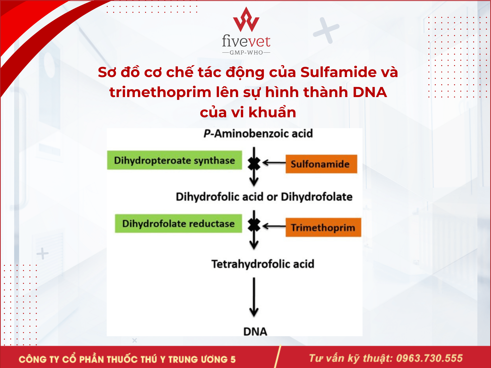 Về mặt dược động học cả sulfamide và trimethoprim đều hấp thu tốt qua đường uống. Quá trình phân bố diễn ra trong cơ thể nhanh chóng vào dịch mô cơ thể và một phần của thuốc được thải trừ qua thận. Chính vì vậy, các dạng bào chế thuốc tập trung vào dạng bột pha nước uống, trộn với thức ăn hay hỗn dịch uống.