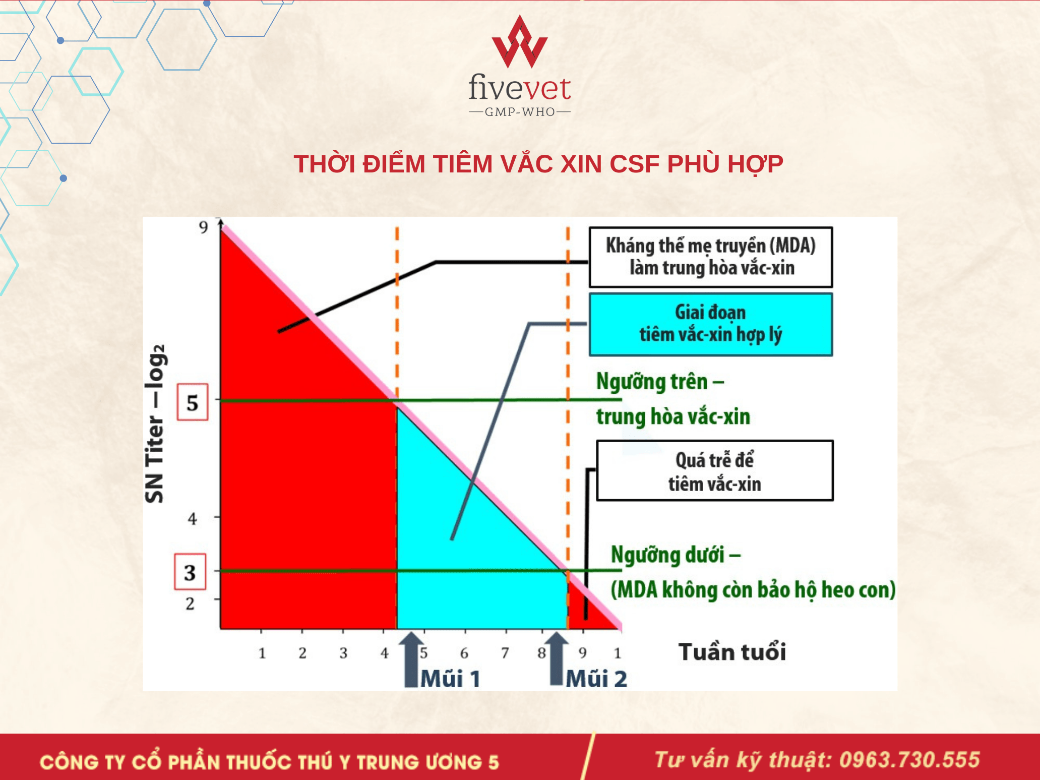 Vì vậy, nên chọn thời điểm tiêm phòng cho heo con khi kháng thể mẹ truyền nhỏ hơn 5log