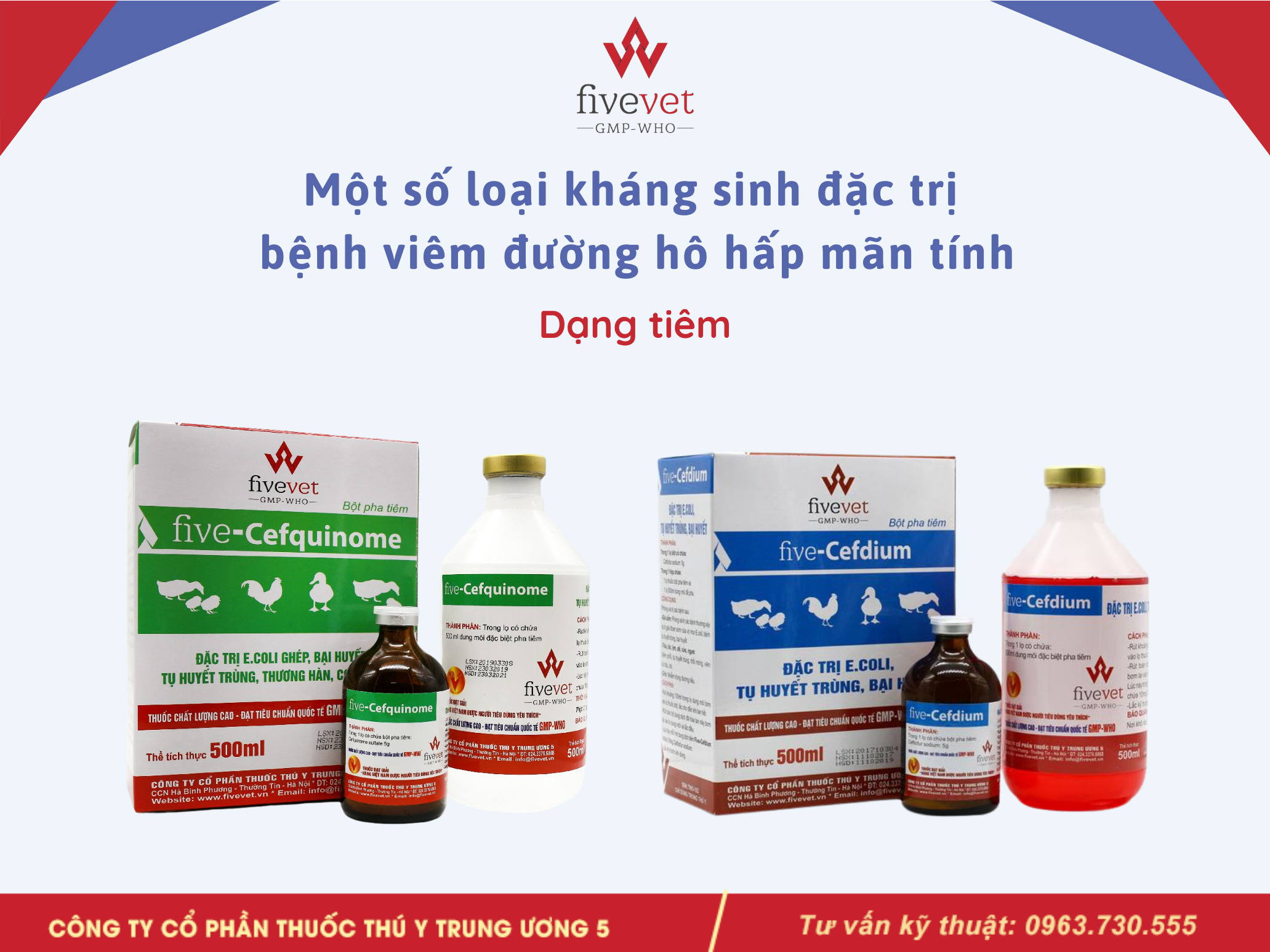* Kháng sinh dạng tiêm: Five-Cefdium, Five-Cefquinome, Five-Gentatylo Inj, Combo 3in1 Ceftri SDM, Ceta-Gen couple, Five-Cef-Lipe-Dex,… Liều theo hướng dẫn trên bao bì sản phẩm. Liệu trình 2-3 ngày.