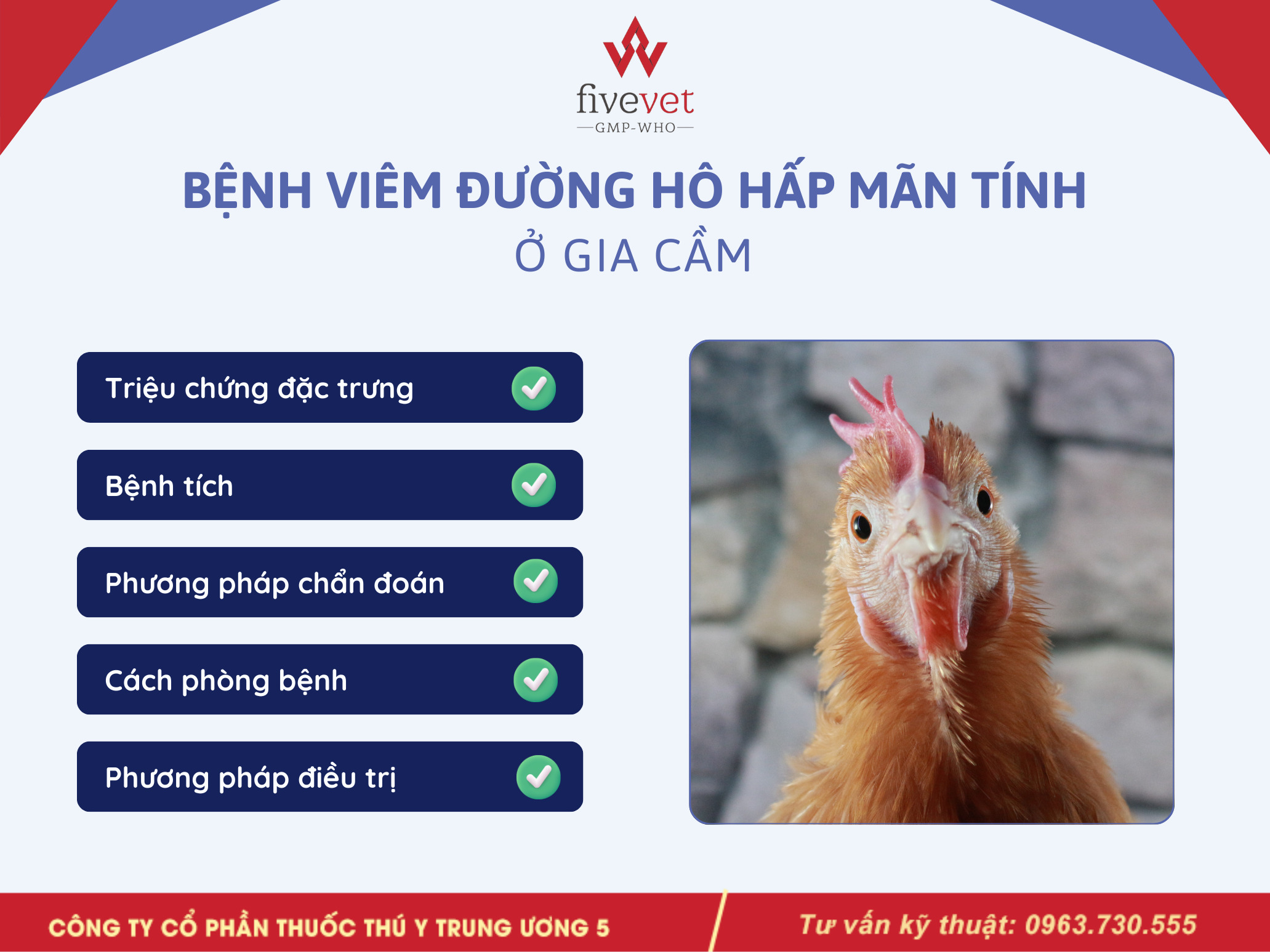 Bệnh viêm đường hô hấp mãn tính ở gà hay viêm xoang truyền nhiễm ở gà tây, gây ra bởi vi khuẩn Mycoplasma gallisepticum (MG), là một trong những bệnh gây thiệt hại lớn cho ngành chăn nuôi gia cầm, đặc biệt vào mùa đông xuân ở miền Bắc. Bệnh làm giảm chất lượng thịt, giảm sản lượng trứng, tăng tỷ lệ FCR, tăng chi phí chăn nuôi, giảm hiệu quả kinh tế. Trong bài viết này, Fivevet sẽ cung cấp thông tin chi tiết về các triệu chứng, cách phòng và điều trị bệnh viêm đường hô hấp mãn tính ở gia cầm.