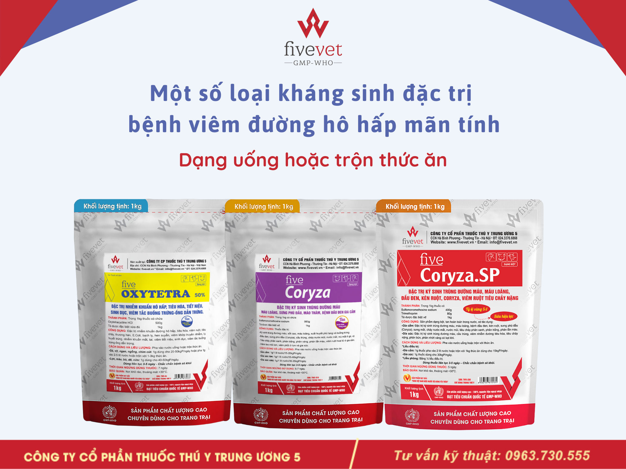 * Kháng sinh dạng uống hoặc trộn thức ăn: Five-Coryza, Five-Coryza.SP, Five-Oxytetra 50%, Five-Sultrim, Five-LincoSpec, Five-Paflo, Five-Tialin, Five-Tylosin 98%, TW5-Doxy.500,… sử dụng theo hướng dẫn trên bao bì sản phẩm. Liệu trình liên tục 3-5 ngày.