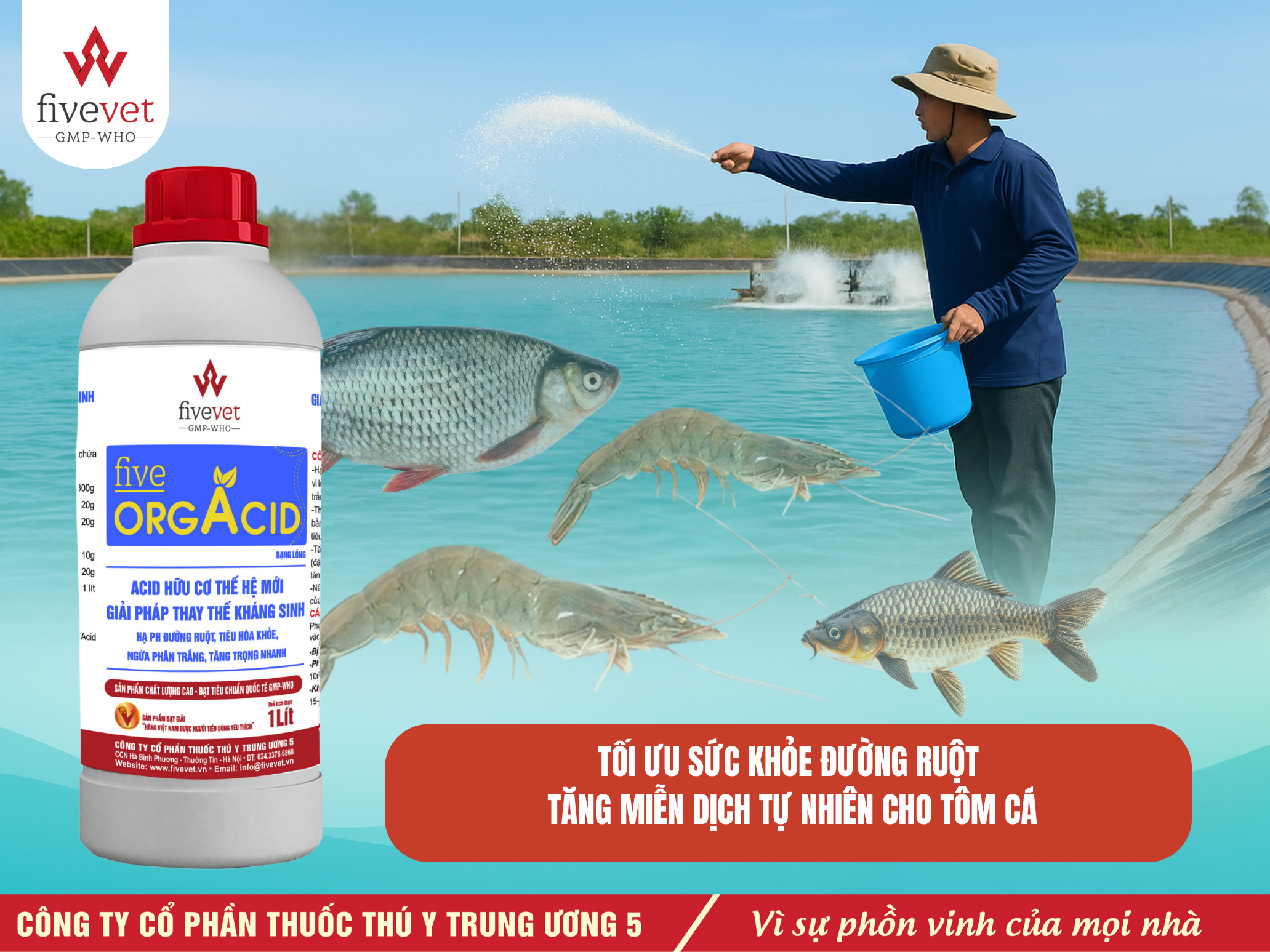 Từ thành phần tự nhiên, sự kết hợp khoa học đến cách dùng linh hoạt, Five-Orgacid TS không chỉ là giải pháp hiệu quả trong kiểm soát mầm bệnh mà còn là cánh tay đắc lực giúp người nuôi xây dựng mô hình nuôi trồng thủy sản sạch, không kháng sinh, hướng tới tiêu chuẩn xuất khẩu cao nhất và phát triển bền vững lâu dài.