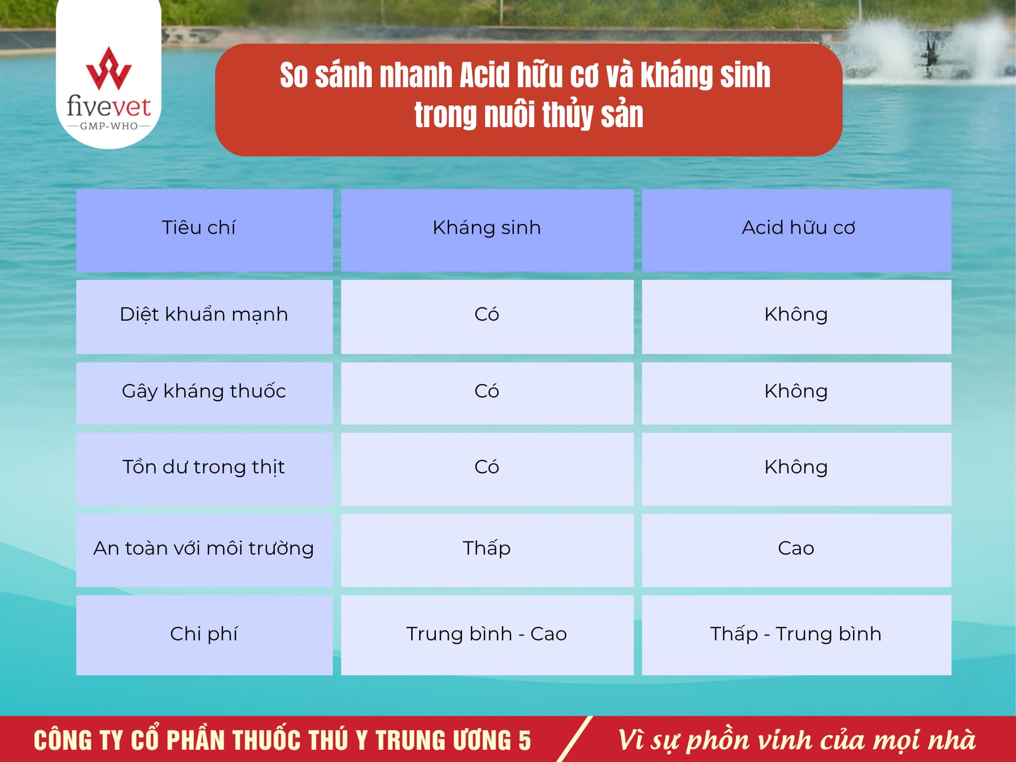 Dù kháng sinh có tác dụng nhanh và mạnh hơn, nhưng acid hữu cơ lại vượt trội về tính an toàn, bền vững và dễ kiểm soát trong quá trình nuôi.