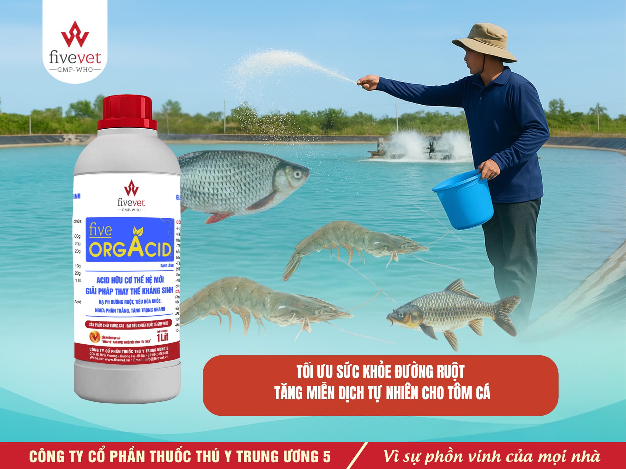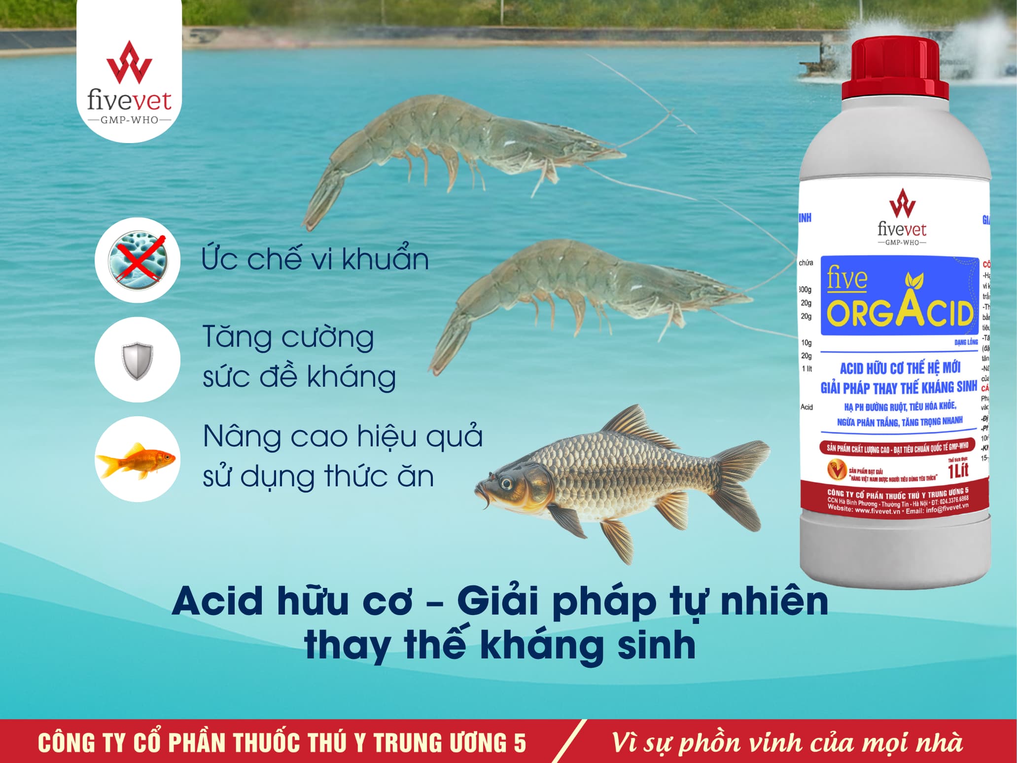 Trong bối cảnh tình trạng kháng kháng sinh ngày càng gia tăng, việc tìm kiếm giải pháp thay thế an toàn và bền vững là yêu cầu cấp thiết trong ngành nuôi trồng thủy sản. Acid hữu cơ đã được chứng minh là một lựa chọn hiệu quả do khả năng ức chế vi khuẩn gây bệnh, cải thiện hệ vi sinh đường ruột, tăng cường sức đề kháng và nâng cao hiệu quả sử dụng thức ăn. Hiểu được nhu cầu thực tế của người nông dân, nhiều doanh nghiệp, trong đó có Fivevet đã nghiên cứu và phát triển các giải pháp sử dụng acid hữu cơ với công thức kết hợp đa dạng từ các acid như formic, lactic, citric, acetic và butyric để giúp phòng ngừa các bệnh đường ruột, giảm tỷ lệ tử vong và thúc đẩy tăng trưởng tự nhiên cho tôm cá. Không chỉ mang lại hiệu quả kinh tế, giải pháp này còn góp phần giảm tồn dư kháng sinh, đảm bảo an toàn vệ sinh thực phẩm và phát triển thủy sản bền vững.