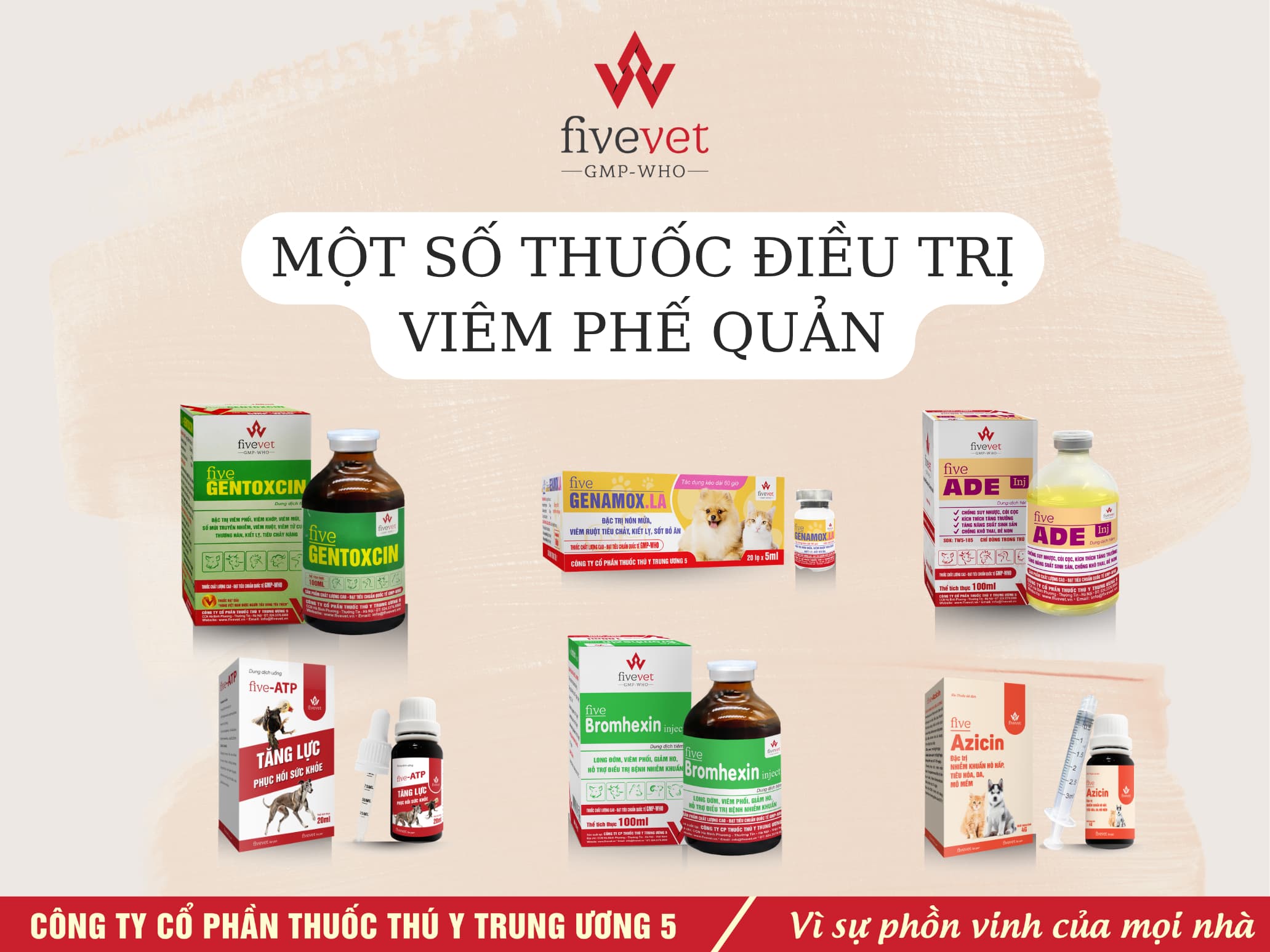 Trong điều trị bệnh viêm phế quản ở chó và mèo, việc sử dụng kháng sinh là yếu tố quan trọng để kiểm soát nhiễm khuẩn. Các loại kháng sinh như Five-Amox@.LA, Five-Genamox.LA, Five-Gentoxcin và Five-Azicin là những lựa chọn phổ biến, giúp kiểm soát tình trạng nhiễm khuẩn và tiêu diệt nhiều loại vi khuẩn khác nhau.