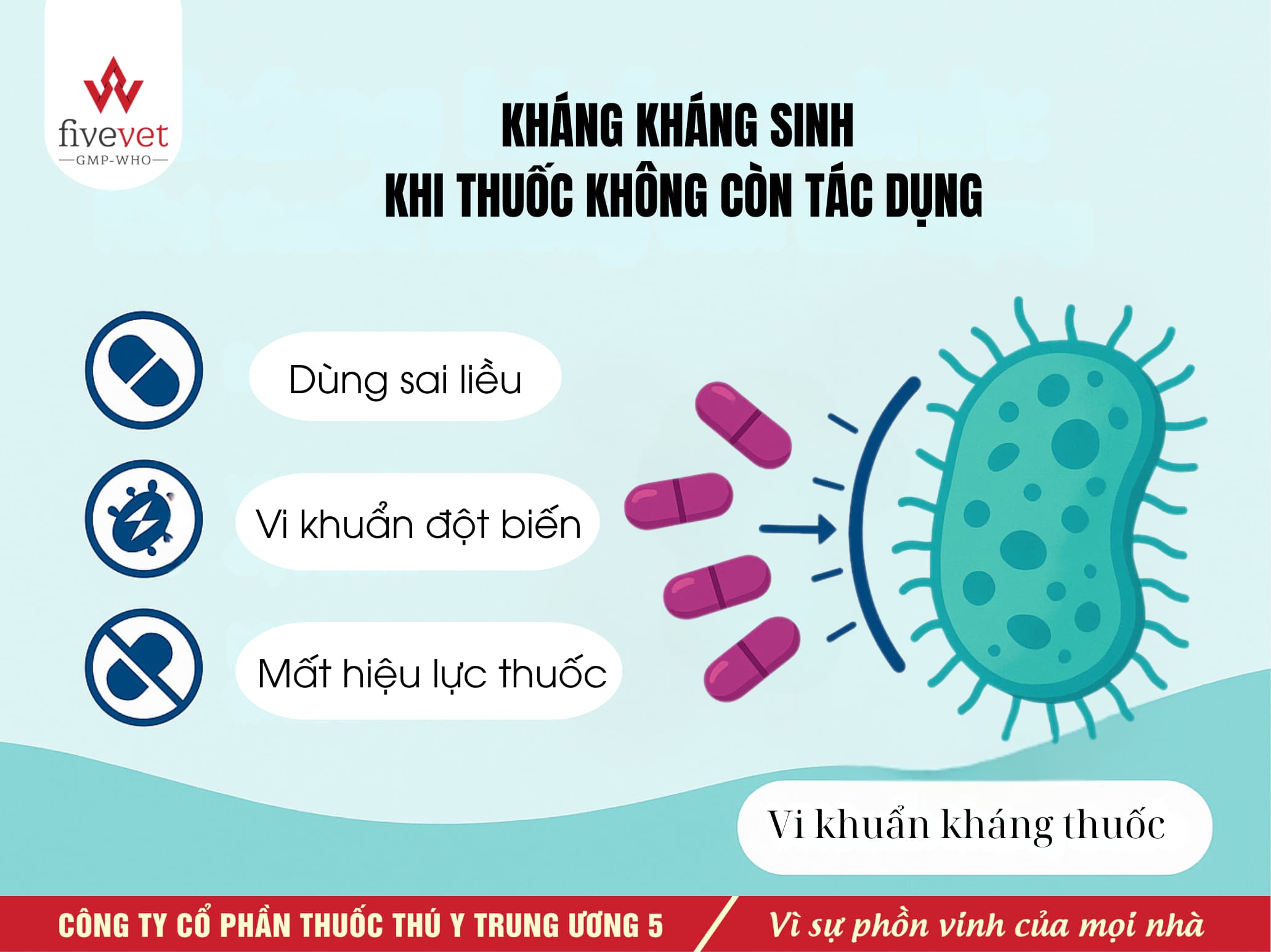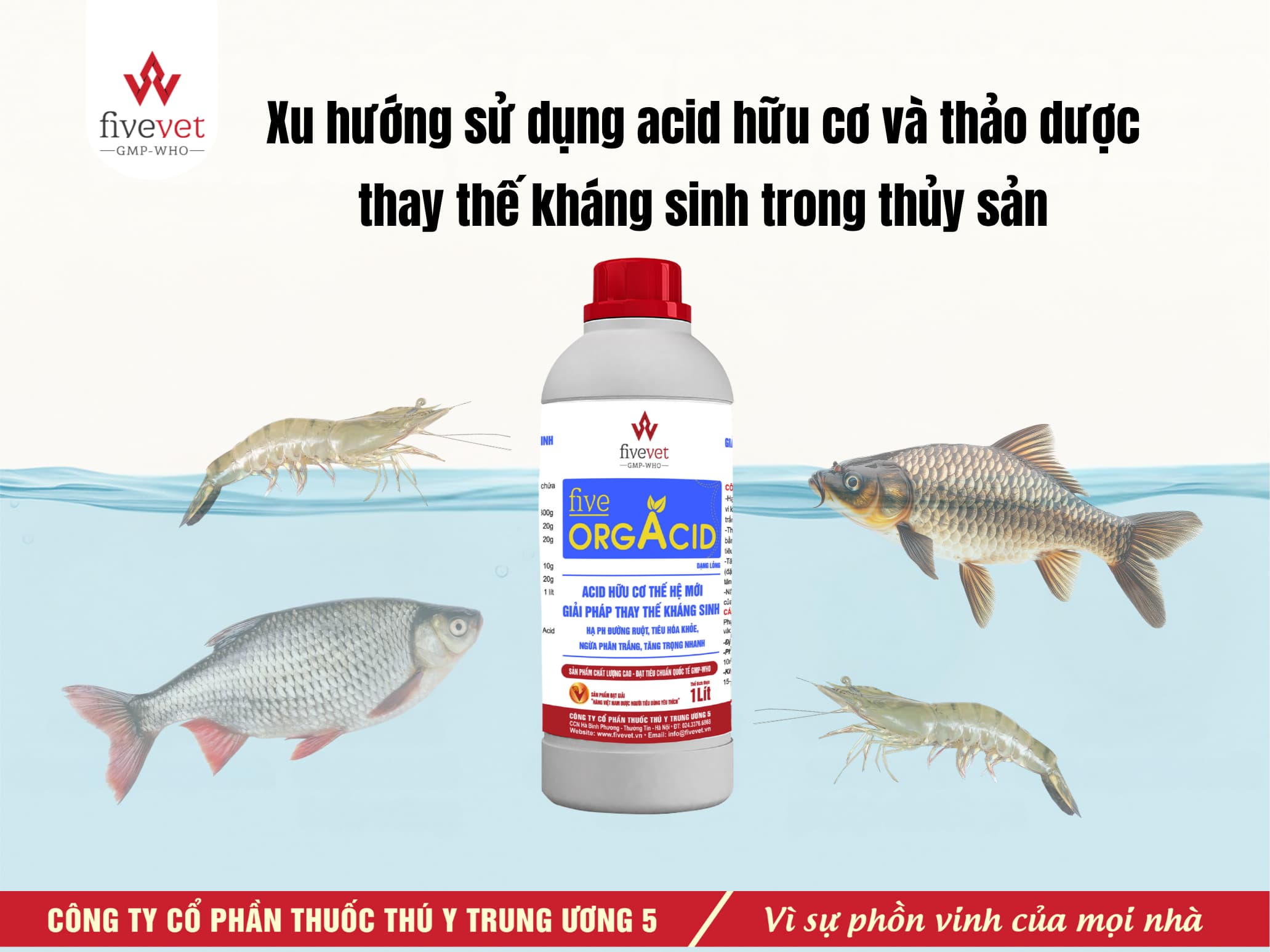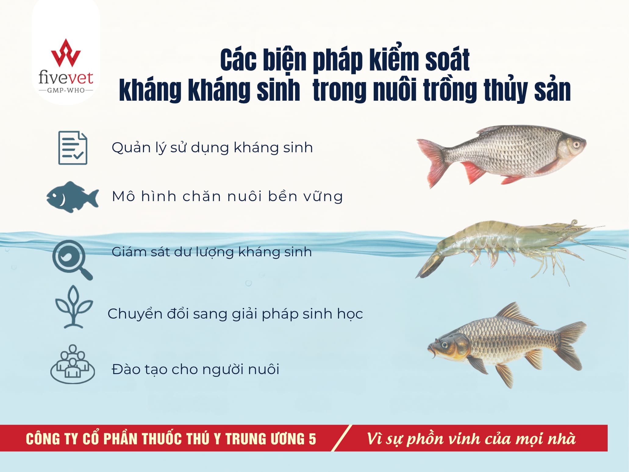 Hiện nay, kháng kháng sinh trong thủy sản đã và đang trở thành một thách thức lớn ngành nuôi trồng và xuất khẩu thủy sản. Việc lạm dụng kháng sinh không chỉ khiến vi khuẩn ngày càng kháng thuốc mà còn để lại dư lượng trong sản phẩm, ảnh hưởng đến sức khỏe người tiêu dùng cũng như uy tín của ngành thủy sản Việt Nam trên thị trường quốc tế. Trước thực trạng đó, việc tìm kiếm các giải pháp thay thế hiệu quả, hạn chế tối đa việc sử dụng kháng sinh trong nuôi trồng thủy sản là yêu cầu cấp thiết. Với định hướng phát triển bền vững, Fivevet đang đóng vai trò tiên phong trong việc nghiên cứu và cung cấp những giải pháp sinh học an toàn, hỗ trợ tăng cường sức đề kháng và kiểm soát mầm bệnh mà không gây ra tình trạng kháng thuốc hay tồn dư kháng sinh trong môi trường nuôi.