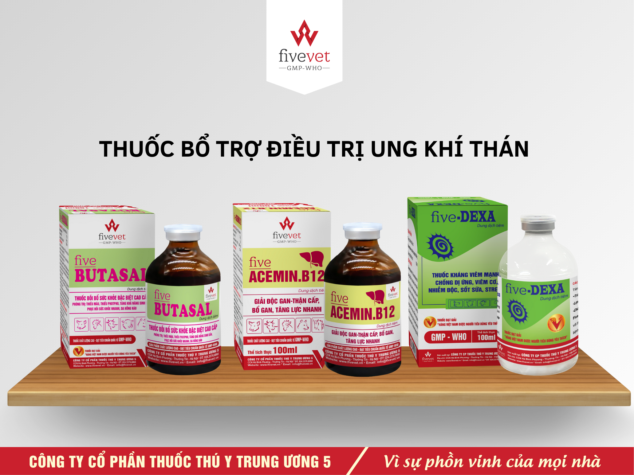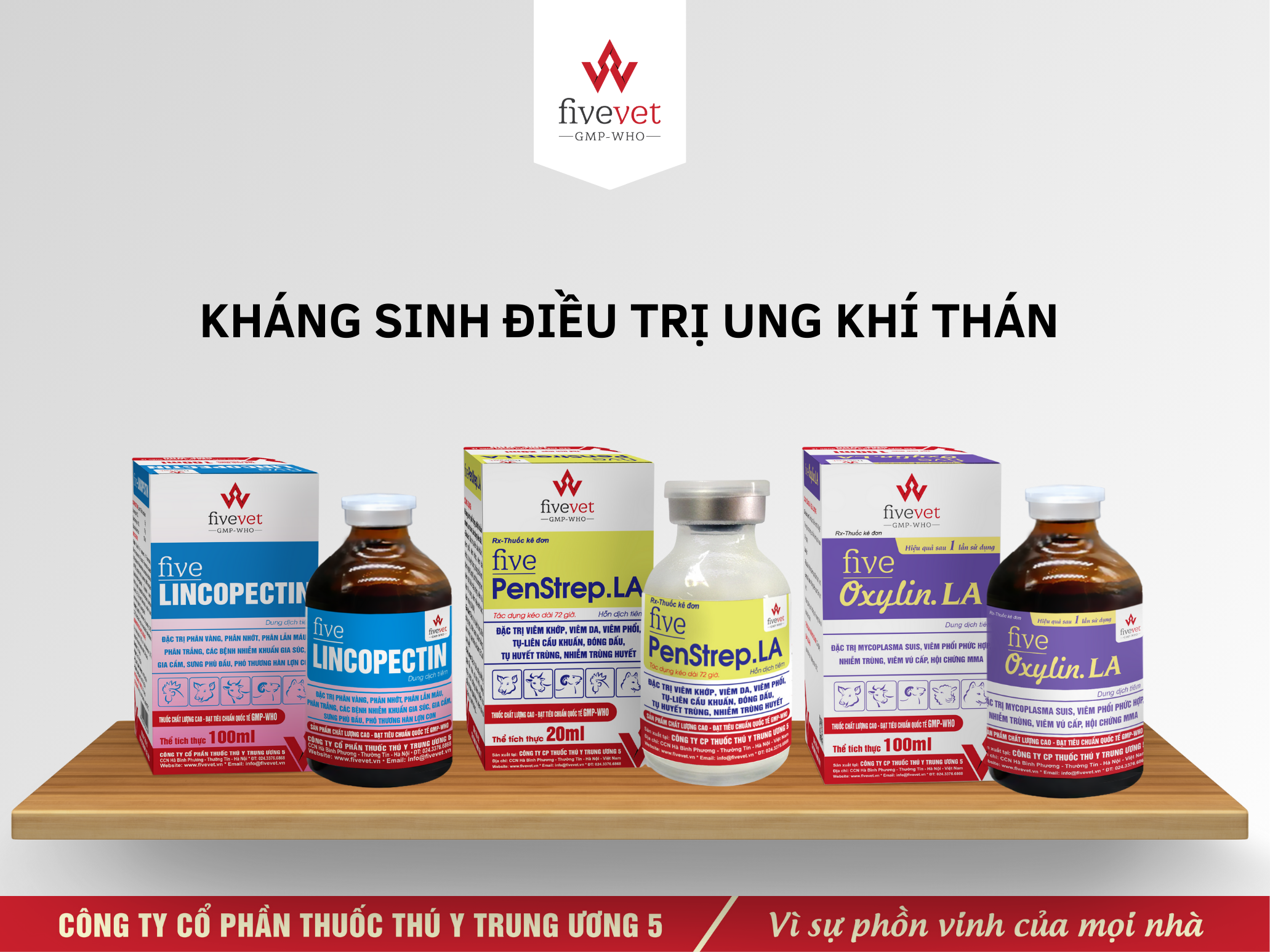 Sử dụng kháng sinh Five-Penstrep.LA, Five-Penicillin, Five-Oxylin.LA, Five-Lincopectin,… tiêm theo hướng dẫn trên bao bì sản phẩm. Kèm các thuốc bổ trợ hạ sốt, kháng viêm, giảm đau sau: Five-Angin.C, Five-Ketofen, Five-Dexa, Five-Butasal, Five-Acemin B12, Five-B.Complex inj, Five-Gluco.KC namic,…