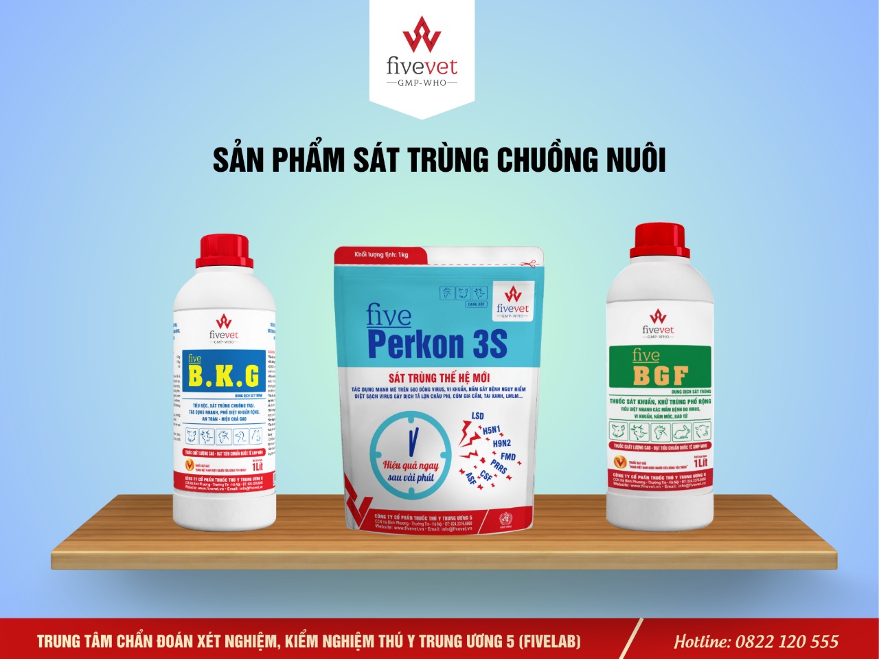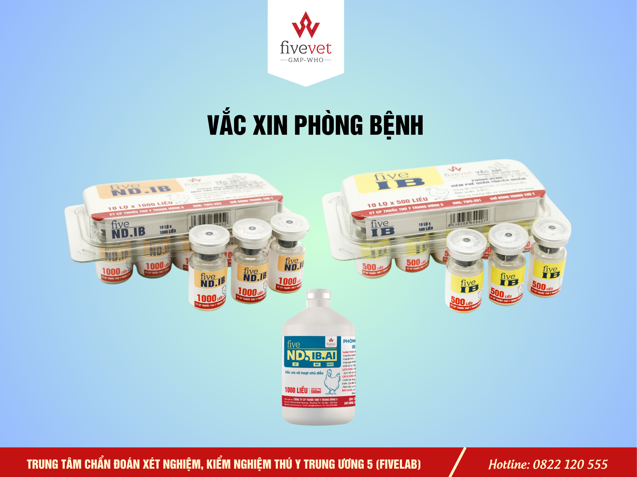 Fivevet cung cấp vắc-xin đặc hiệu như Five-IB, Five-ND.IB, cùng các sản phẩm hỗ trợ miễn dịch, men tiêu hóa và giải độc gan thận. Đồng thời, hướng dẫn phác đồ điều trị chi tiết cho từng thể bệnh giúp bà con kiểm soát dịch bệnh hiệu quả và an toàn.