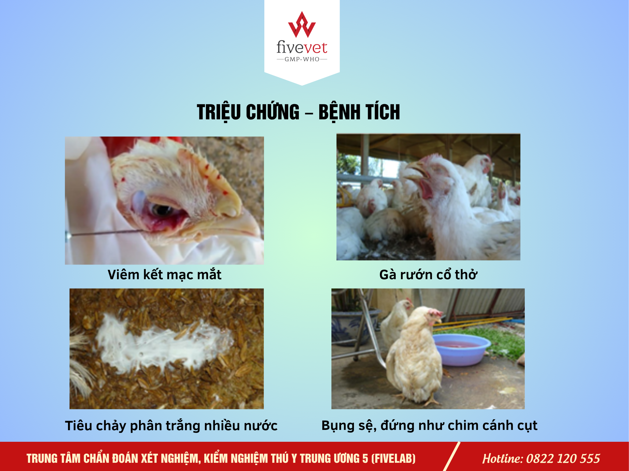 - Ho, khó thở, thở khò khè, thở rít, rướn cổ đớp khí, gà nằm tụm dưới nguồn nhiệt.