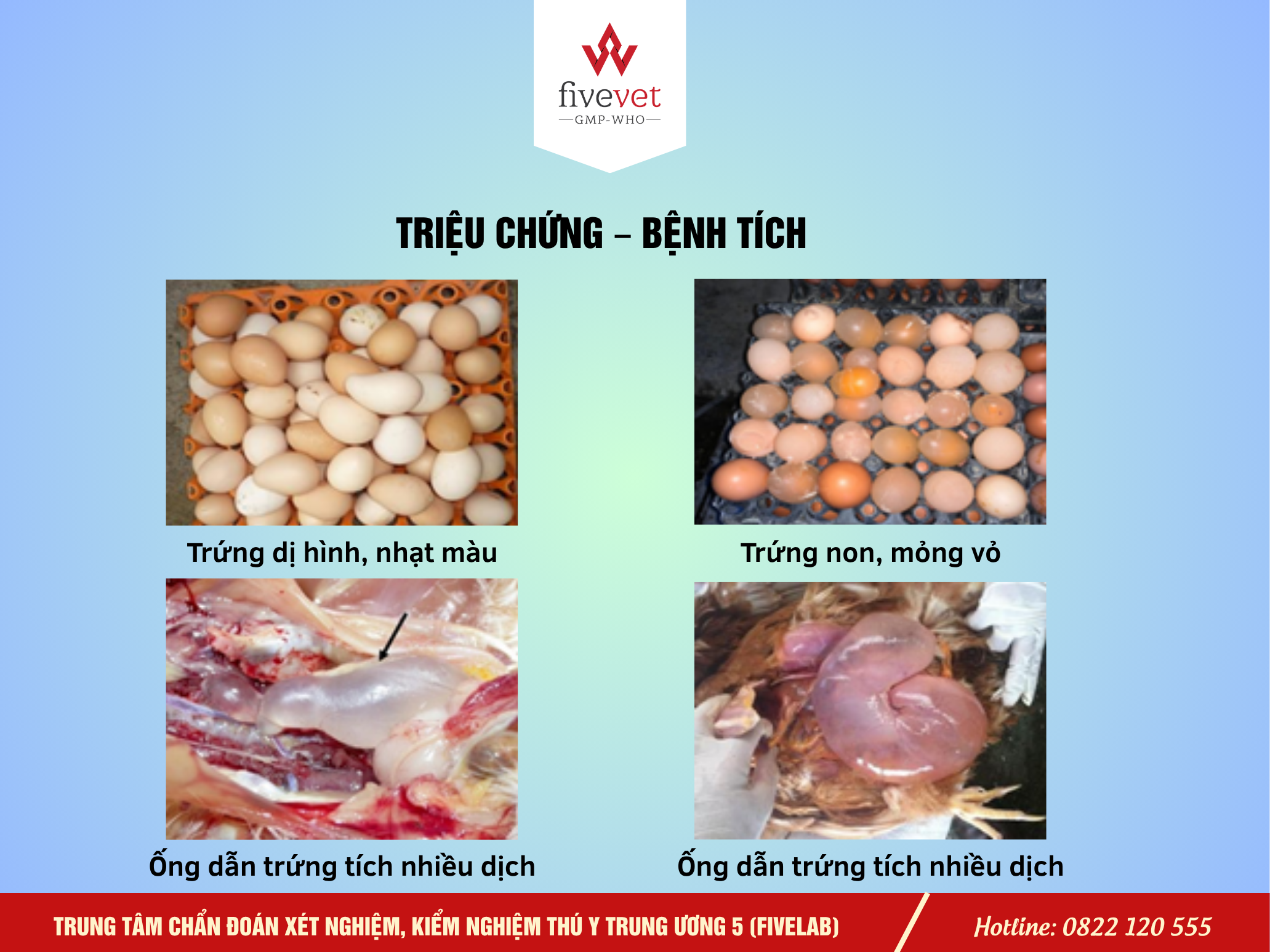 - Bên cạnh những triệu chứng hô hấp, trứng giảm đột ngột (gà giảm đẻ 10-50%), trứng dị hình (méo mó, sần sùi, vỏ mềm, không đều hoặc không có vỏ), trứng nhạt màu, lòng trắng loãng, tỷ lệ ấp nở giảm.