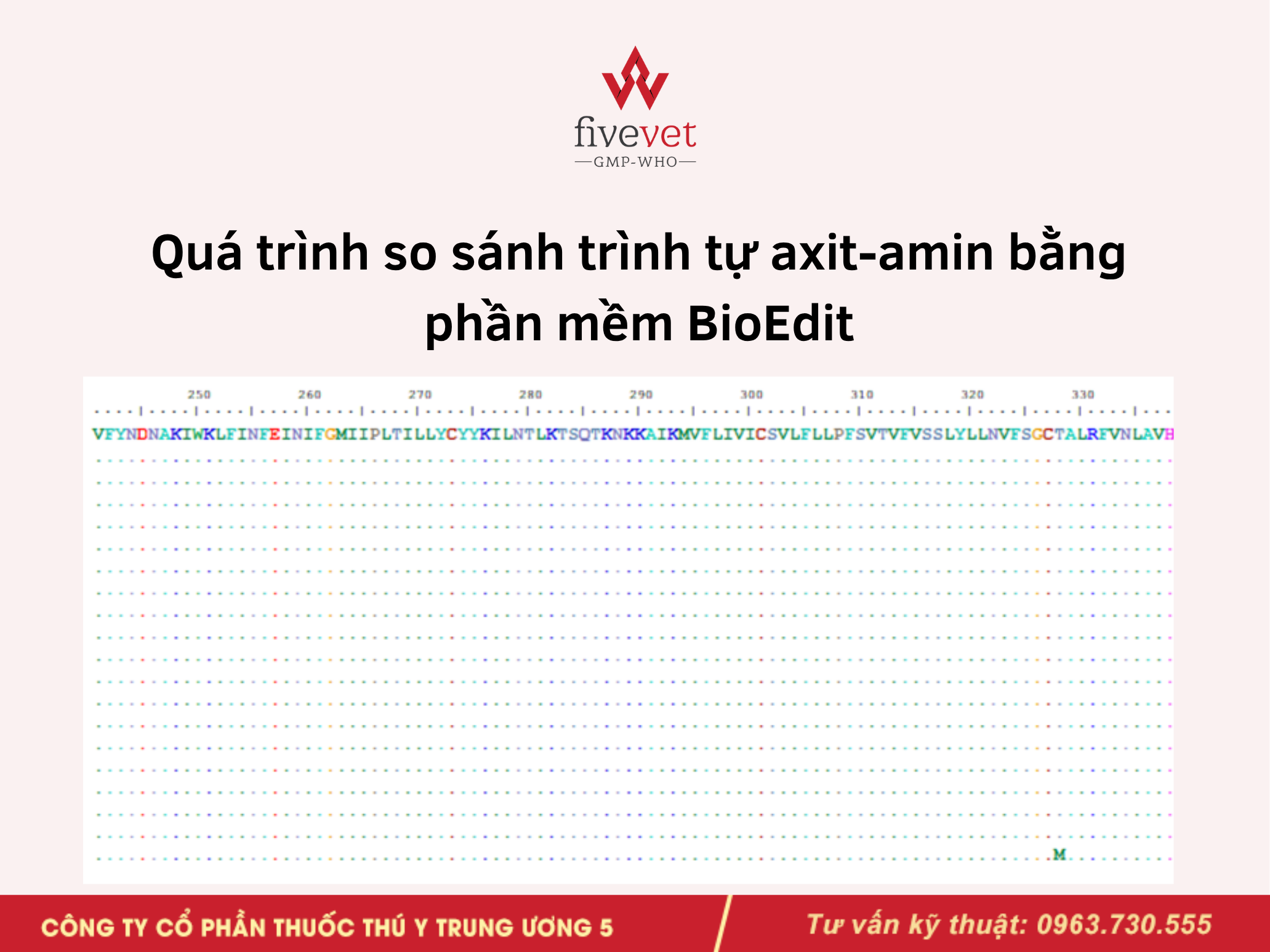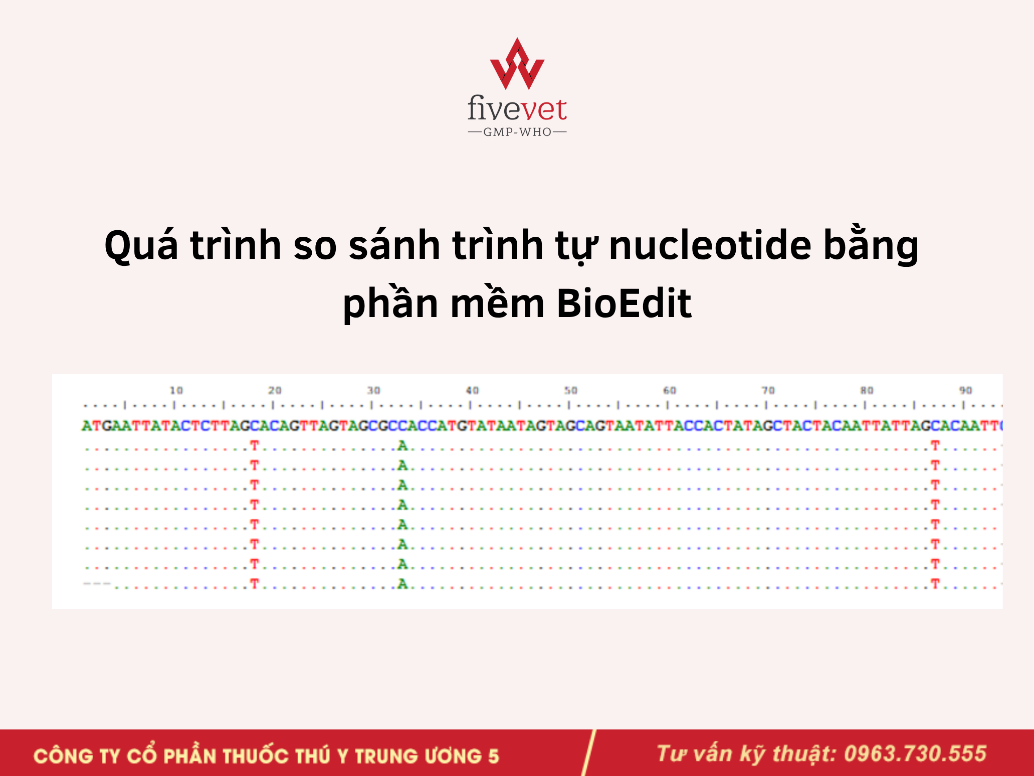 Fivevet, quy trình định danh vi-rút được thực hiện bài bản từ khâu tách chiết axit nucleic, PCR khuếch đại gen mục tiêu, giải trình tự bằng phương pháp Sanger, đến phân tích dữ liệu bằng phần mềm chuyên biệt như BioEdit và MEGA X. Đây là giải pháp thiết yếu trong nghiên cứu, sản xuất vắc-xin và kiểm soát dịch bệnh cho đàn vật nuôi, góp phần bảo vệ an toàn sinh học trong chăn nuôi hiện đại.