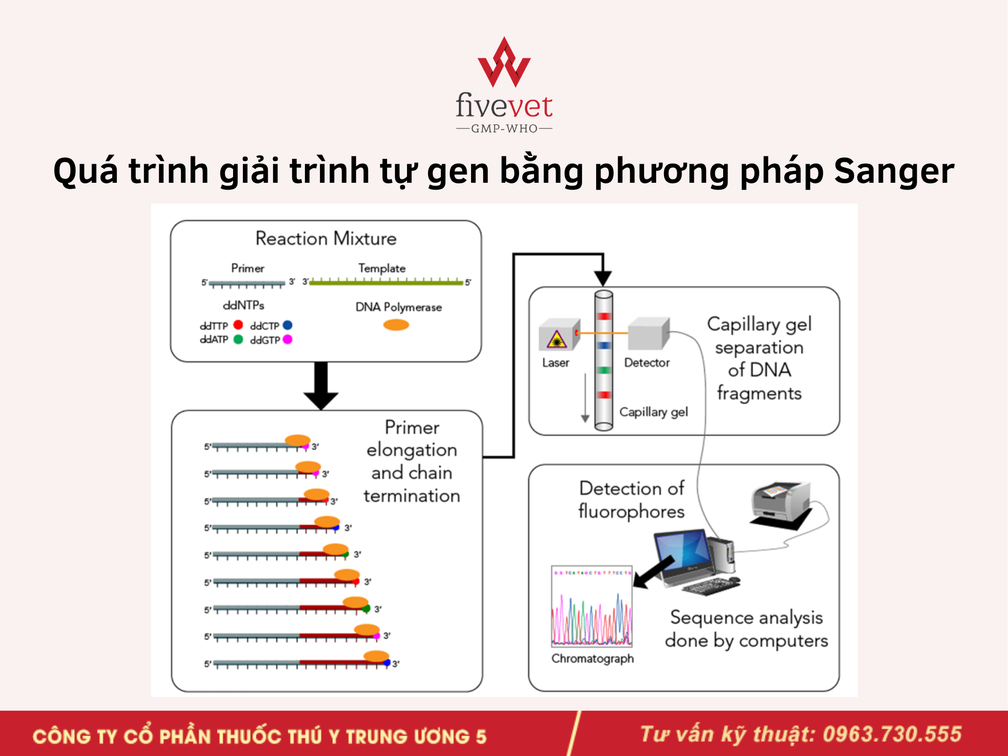 Tại công ty Cổ phần Thuốc Thú Y Trung Ương 5 (Fivevet), kỹ thuật giải trình tự một đoạn gene hoặc toàn bộ gene của vi khuẩn, vi-rút được triển khai thực tế trong công tác định danh chủng loại vi-rút ở vật nuôi. Quá trình này bao gồm:
