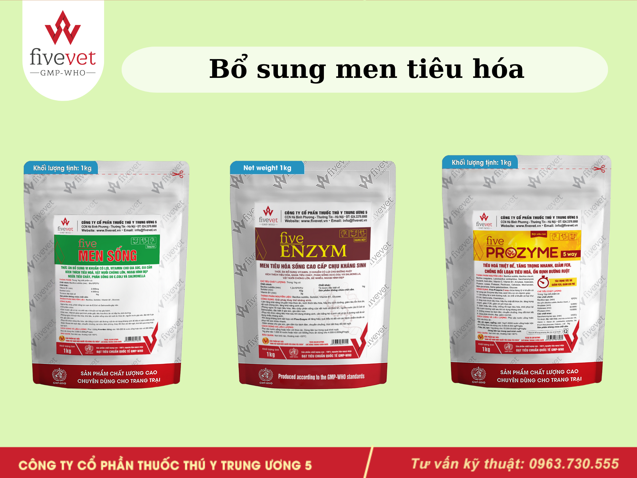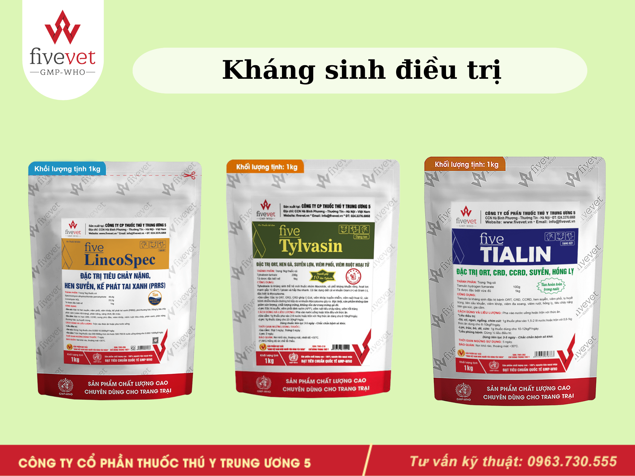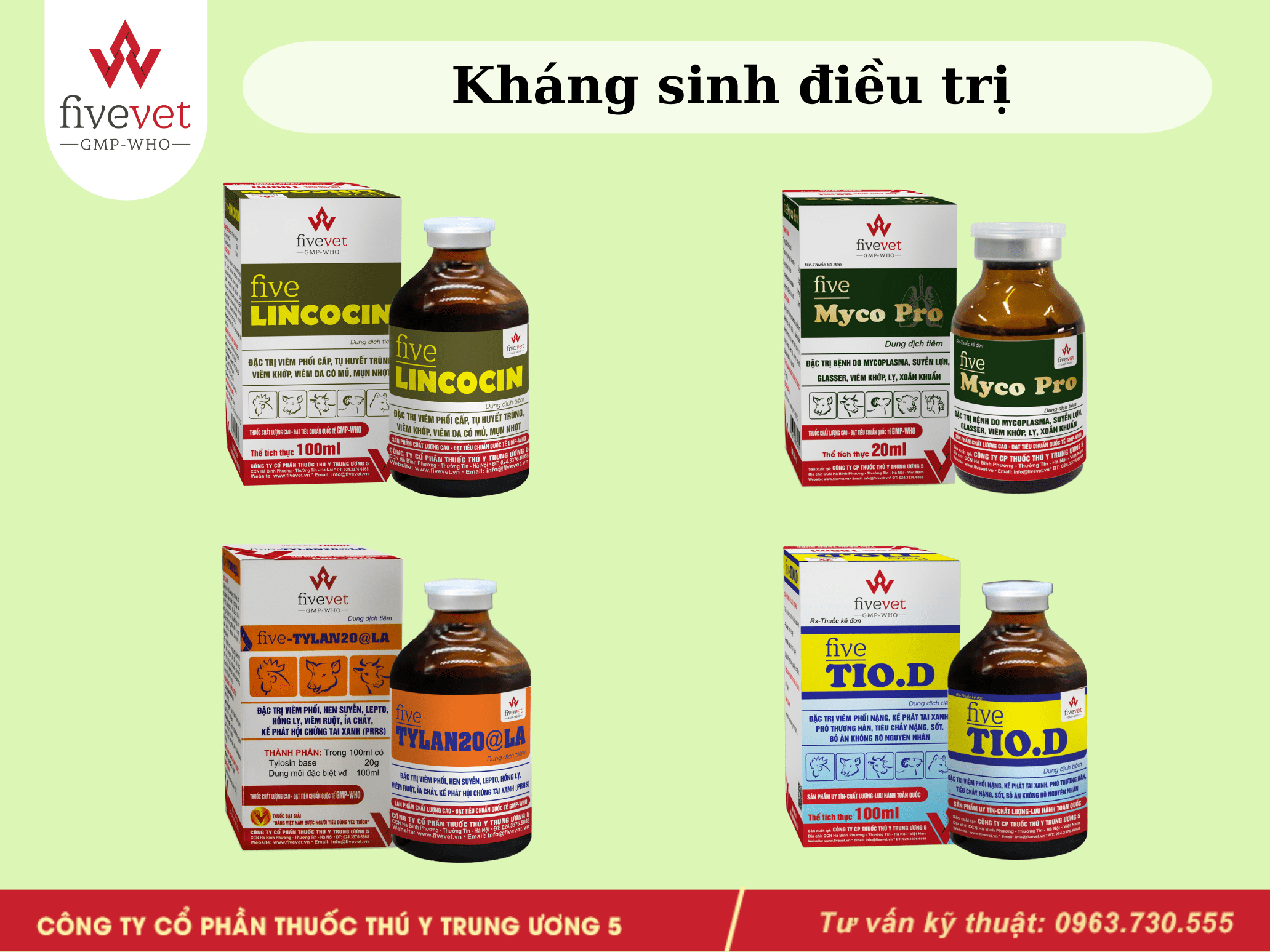 Five-MycoPro, Five-Tylan20@LA, Five-Tio.D, Five-Otylin, Five-Lincocin, Five-Licopectin, Five-Gentatyl Inj,… Kết hợp thuốc bổ trợ: